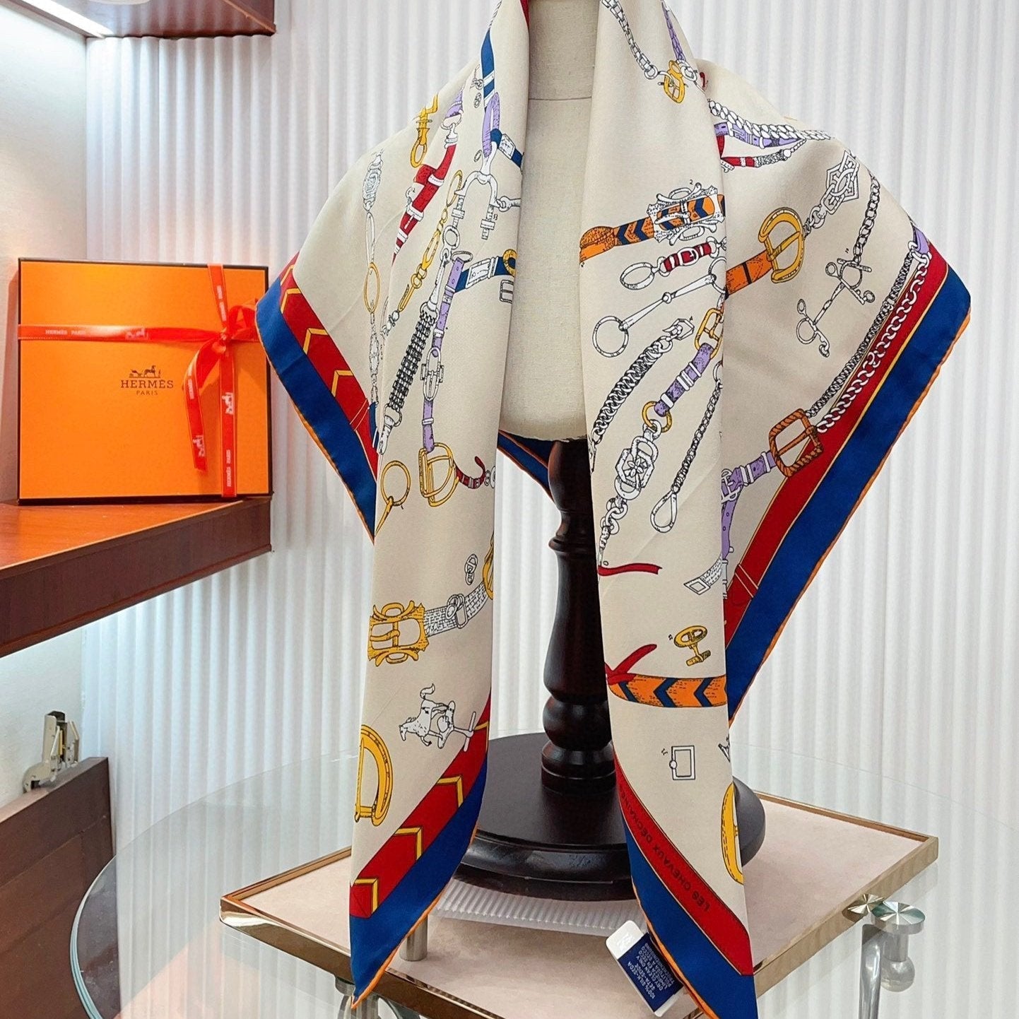 Chevaux Dechaines Shawl 90 CM In White Red Colorful Silk Twill 201031