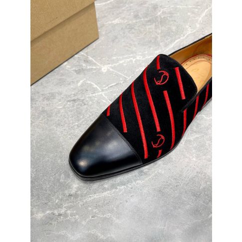 CL Men Loafers Stripe Logo Embroidery Velvet Black Red