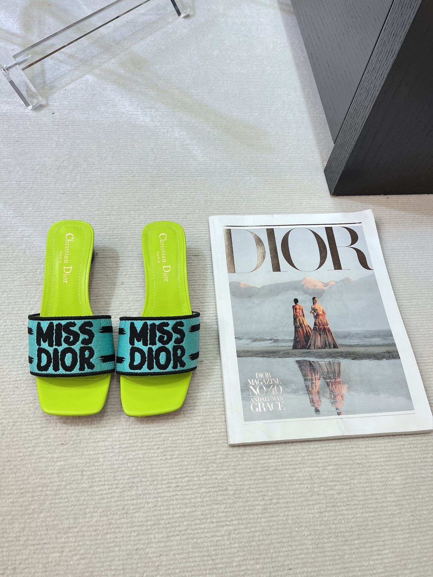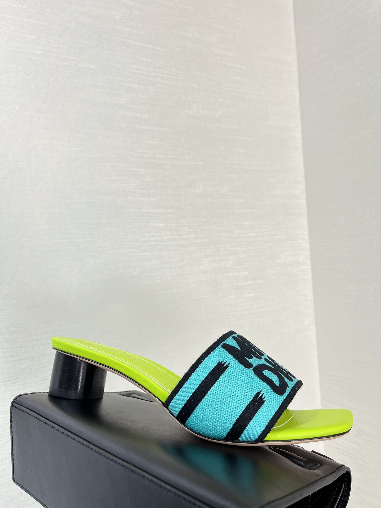 dway heeled slide 35 blue lime embroidered cotton