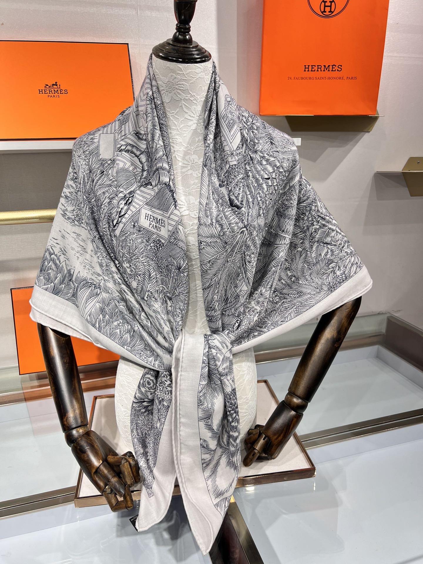 Faubourg Tropical Scarf 135 CM Grey White Cashmere And Silk