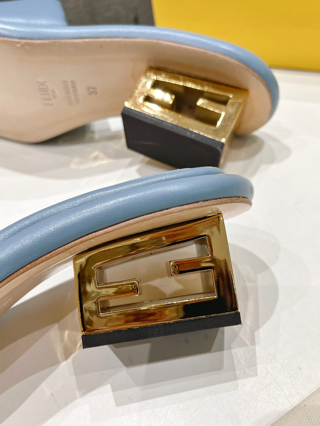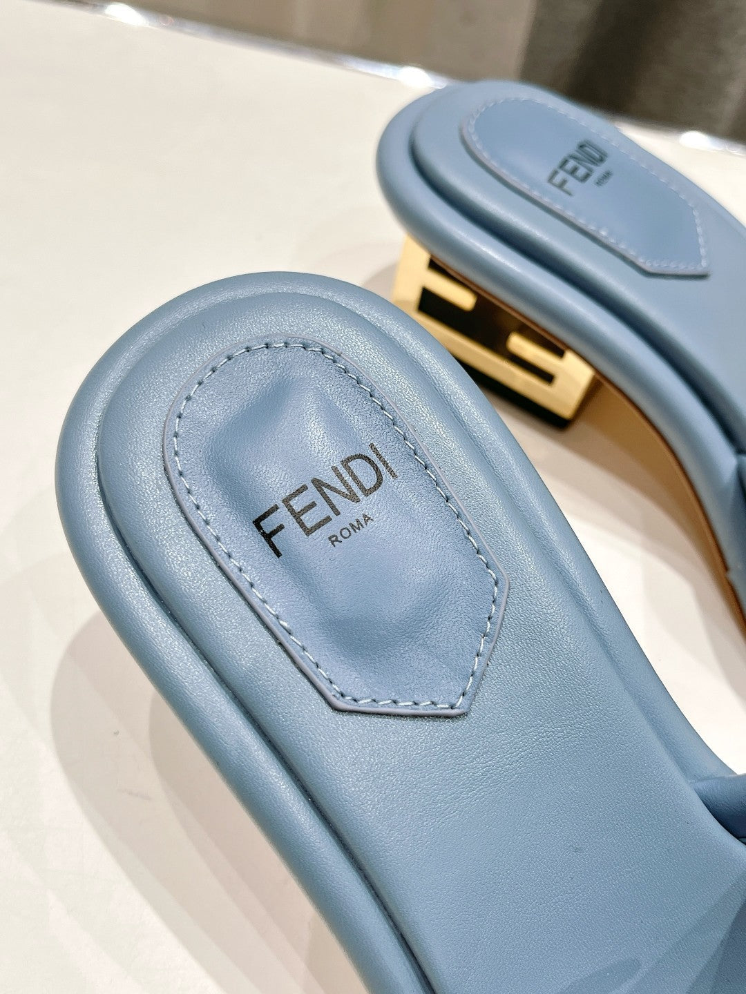 FENDI BAGUETTE MEDIUM-HEEL SANDALS 45 MM IN CERULEAN BLUE CALFSKIN