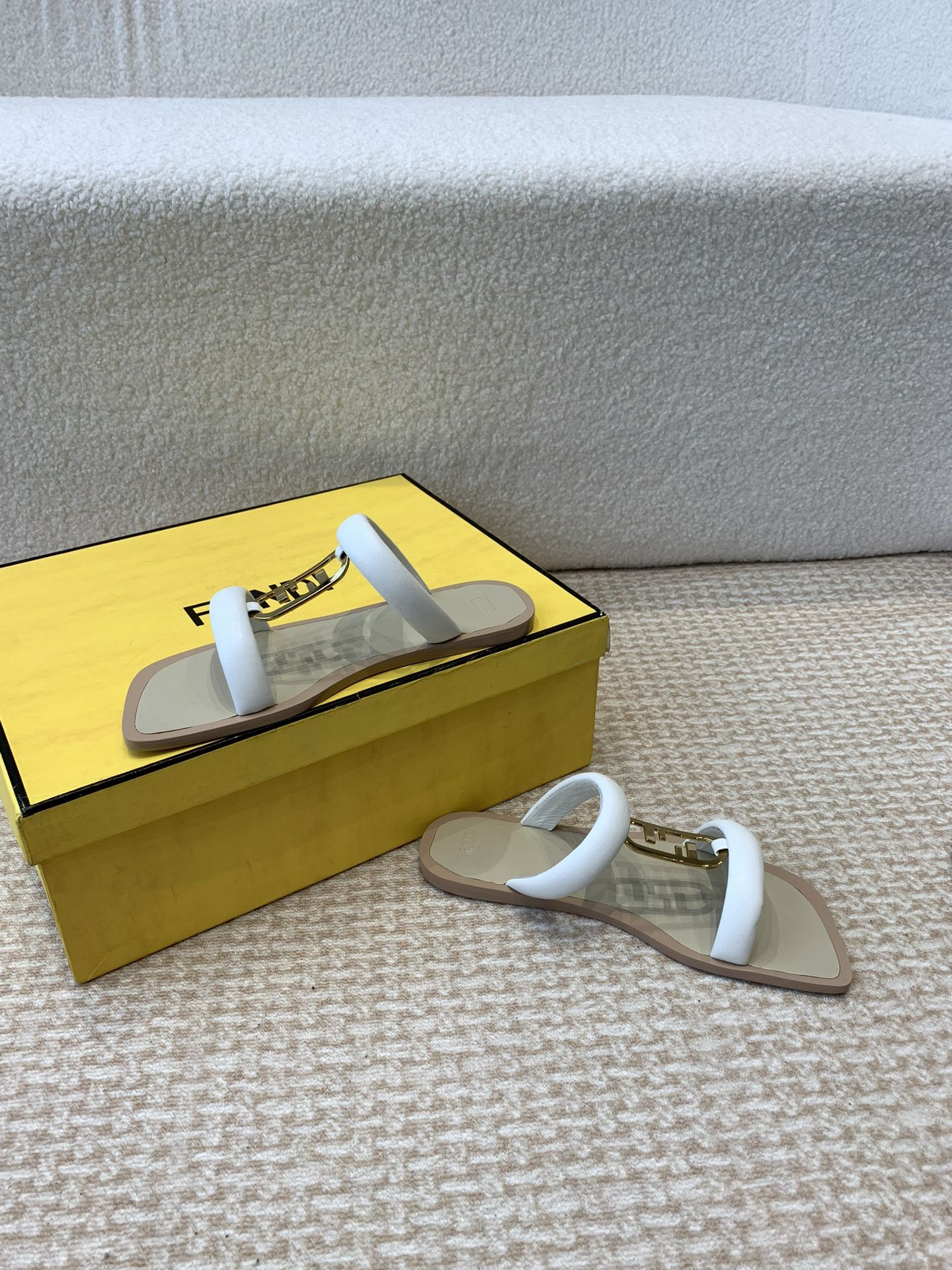 FENDI O'LOCK SLIDES WHITE CALFSKIN WITH GOLD HARDWARE