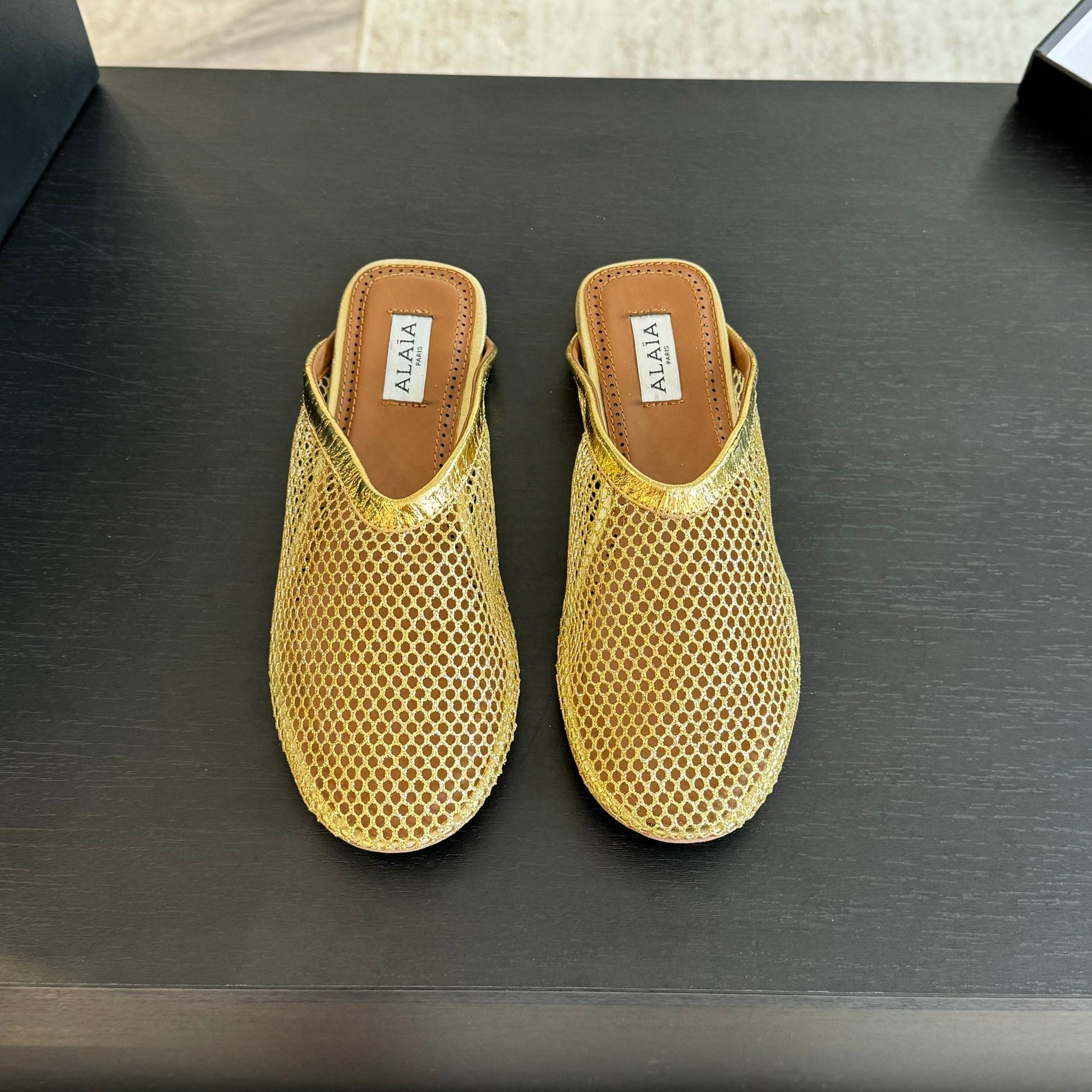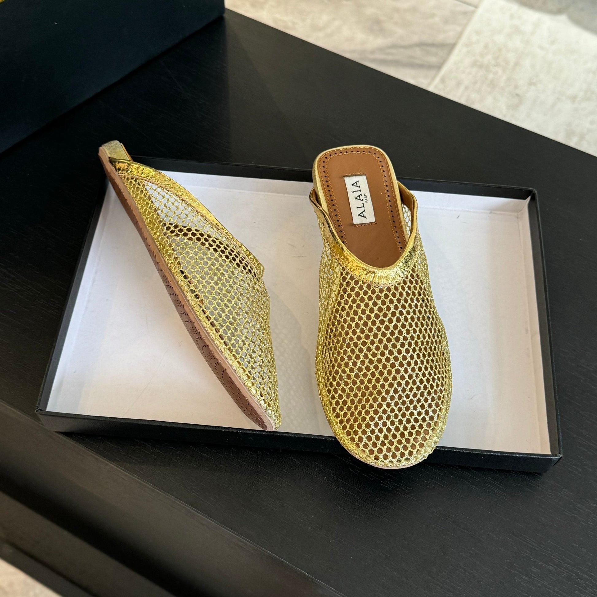 flat mule fishnet gold metalic lambskin