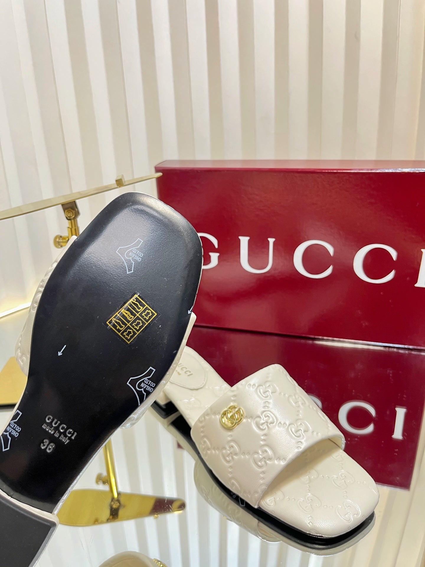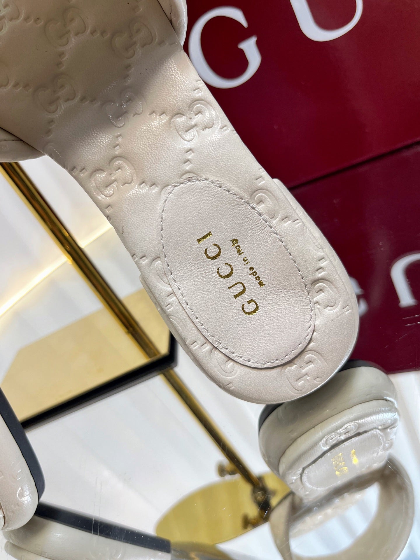 GC Double G Slide Sandals White Embossed Leather 294635