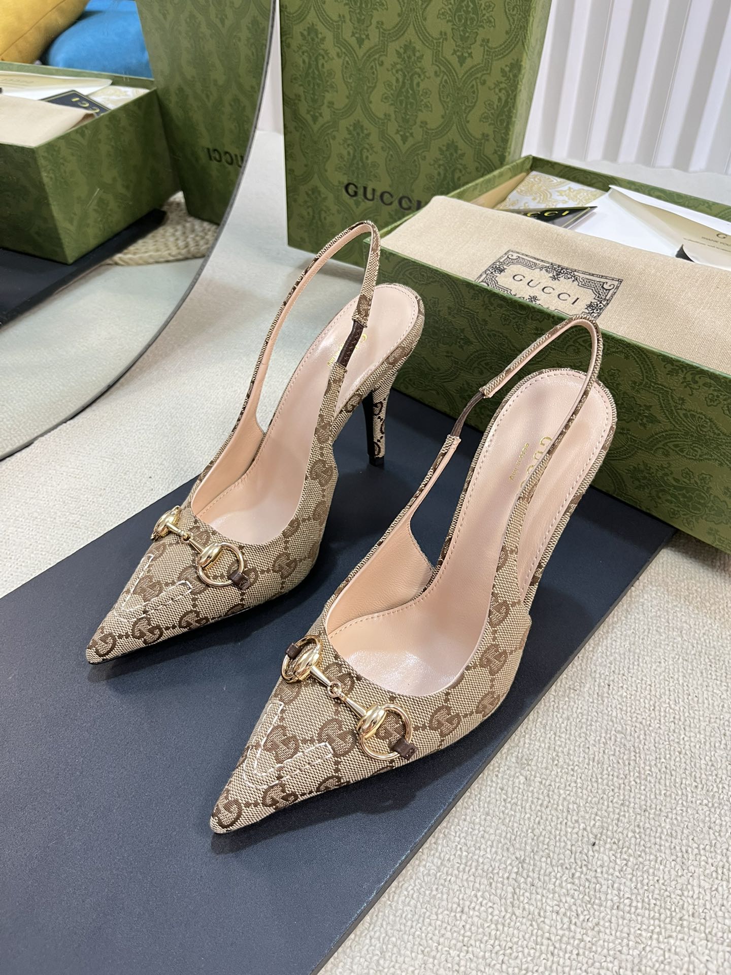 GC Horsebit Slingback Pump 100mm Beige mix Brown Canvas Sheepskin 294566