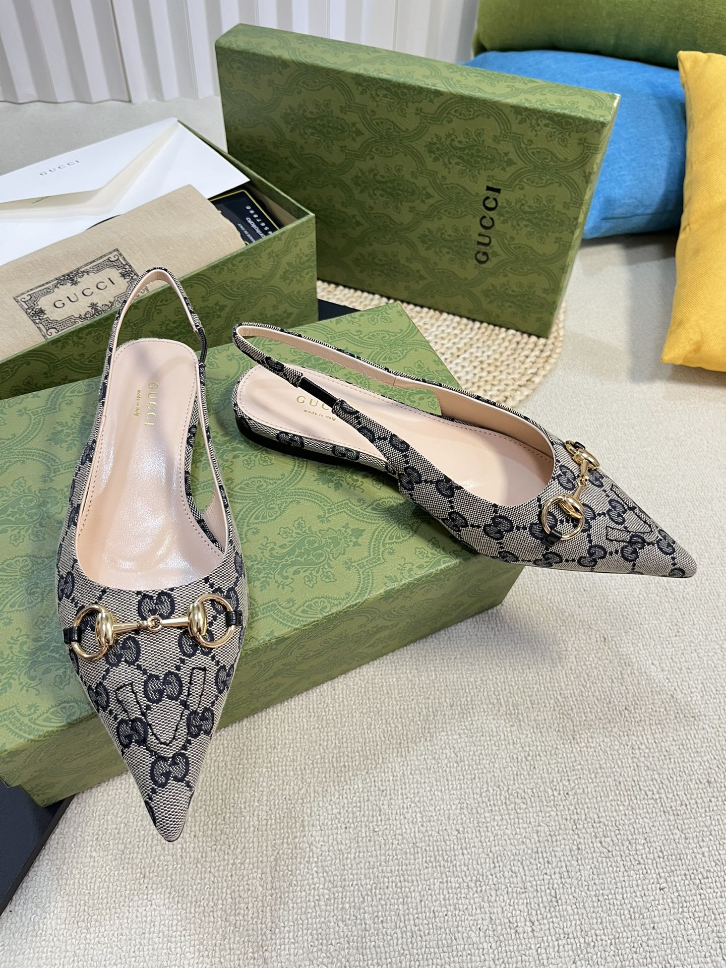 GC Horsebit Slingback Pump 10mm Beige mix Blue Canvas Sheepskin 294553
