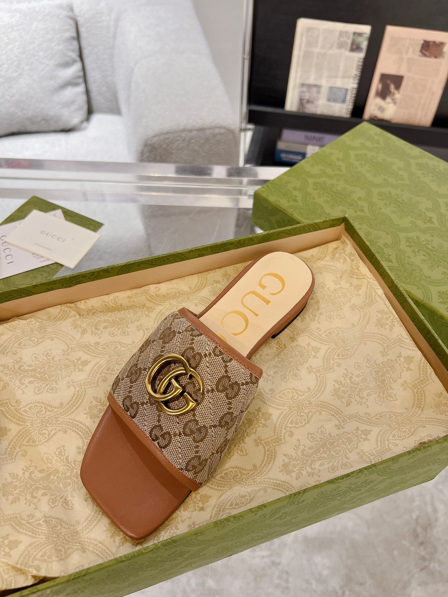 GG EXCLUSIVE SLIDE SANDAL CARAMEL AND BROWN FABRIC