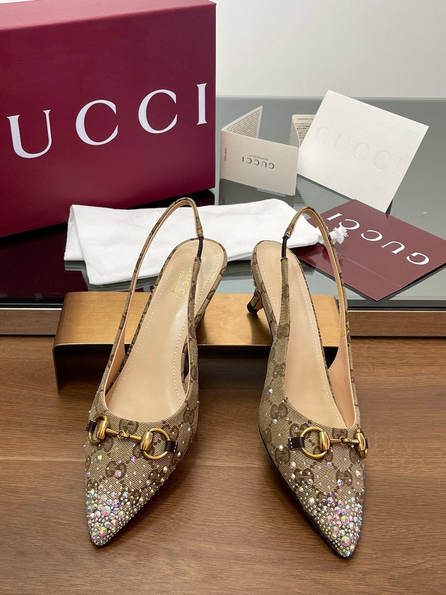 GG Horsebit Slingback 45MM Beige Ebony Monogram Canvas Point Toe Crystal-Embellished