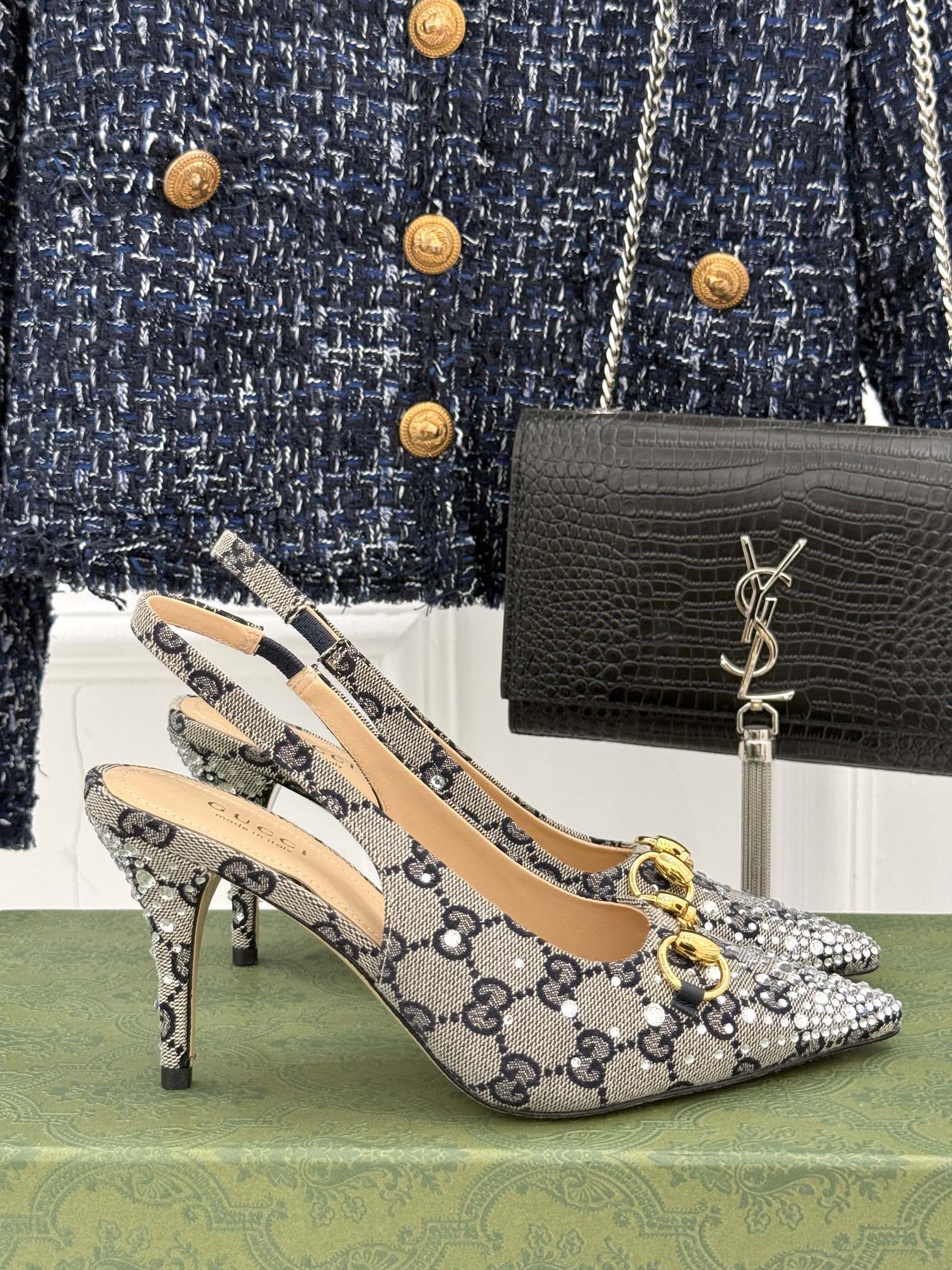 GG Horsebit Slingback 85MM Beige Black Monogram Canvas Point Toe Crystal-Embellished