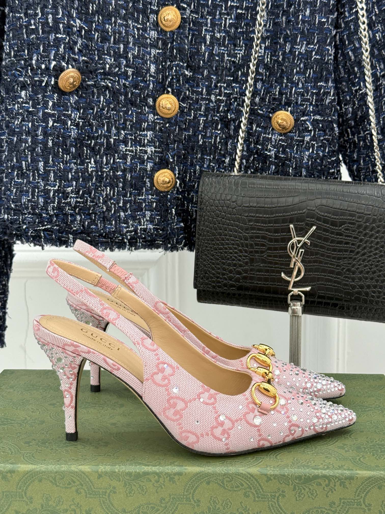 GG Horsebit Slingback 85MM Beige Pink Monogram Canvas Point Toe Crystal-Embellished