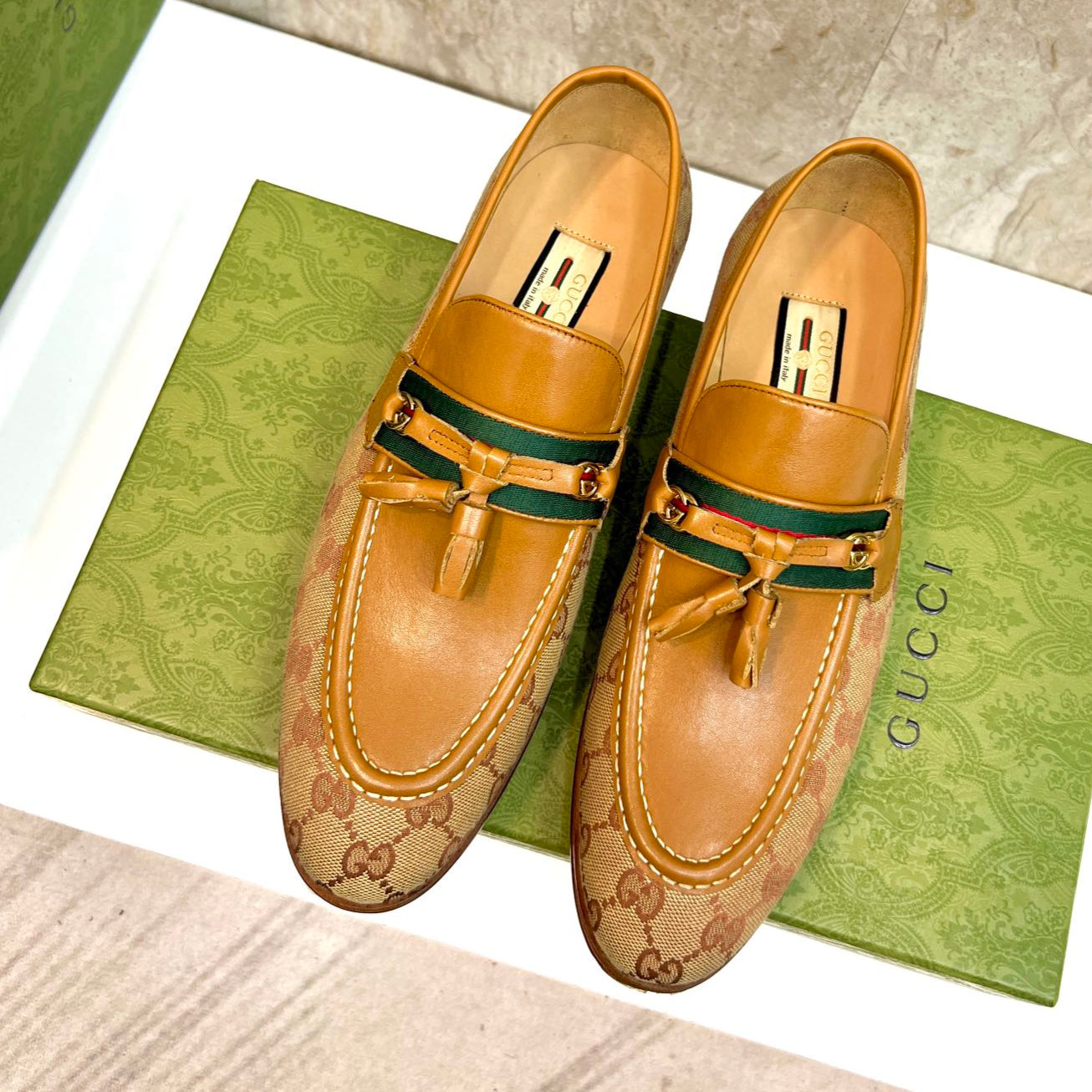 GG Men's Tassel Loafer Light Brown Cowhide Canvas 548743