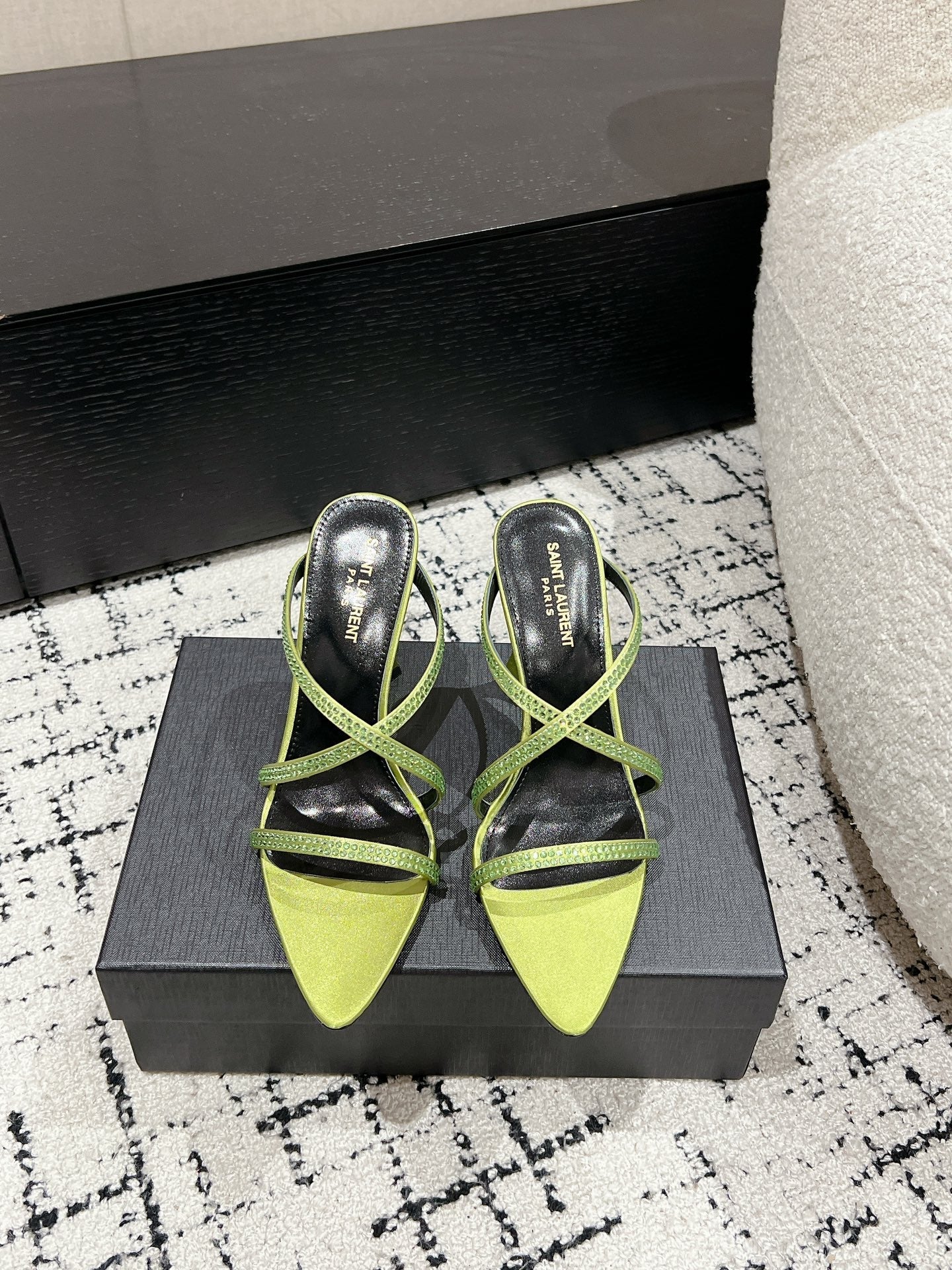HIGH CRYSTAL STRAP SANDALS IN PEAR GREEN SILK