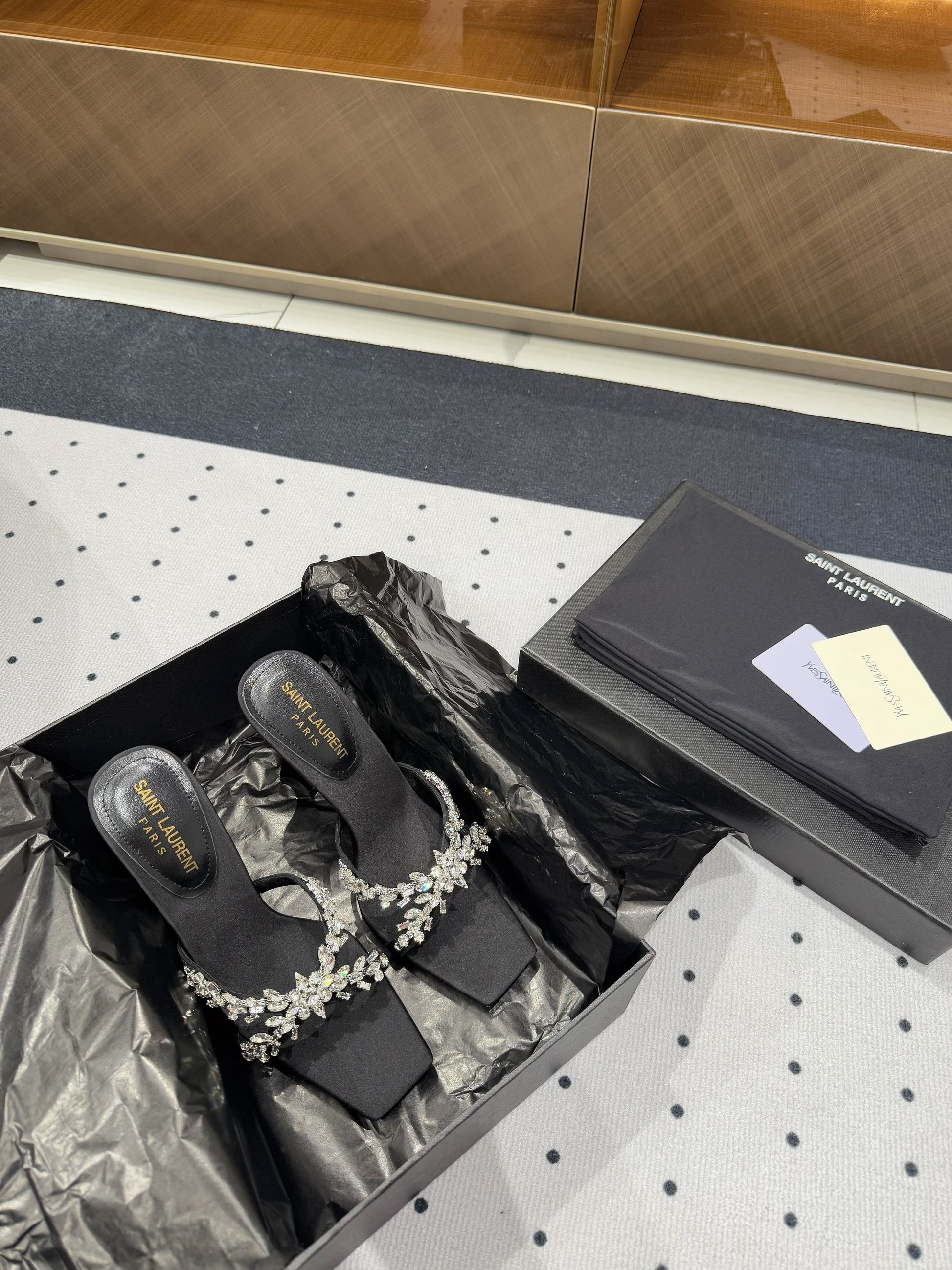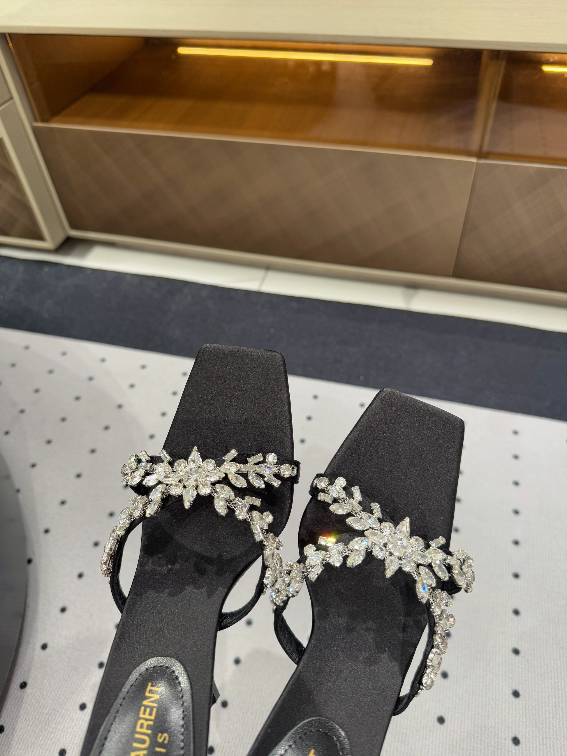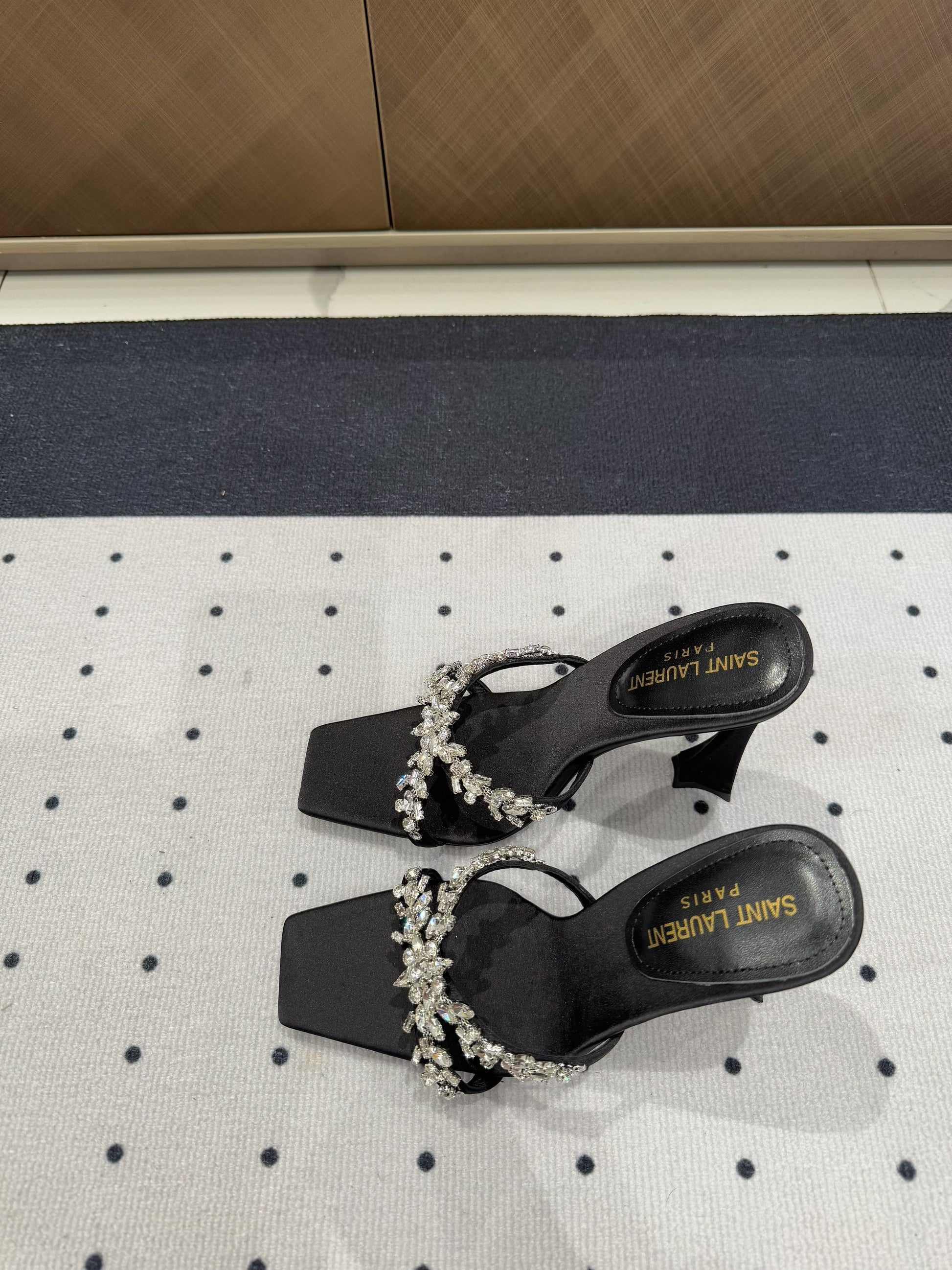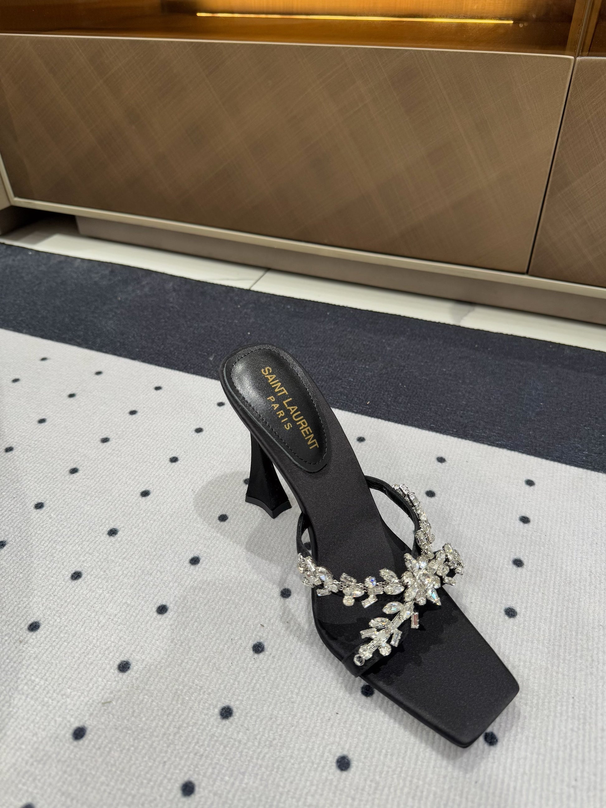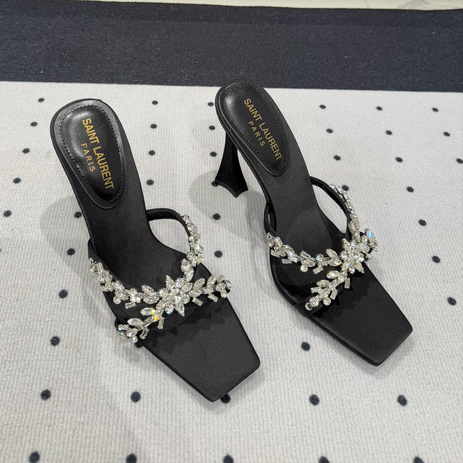 HIGH RHINESTONE CROSS STRAP MULES IN BLACK SILK