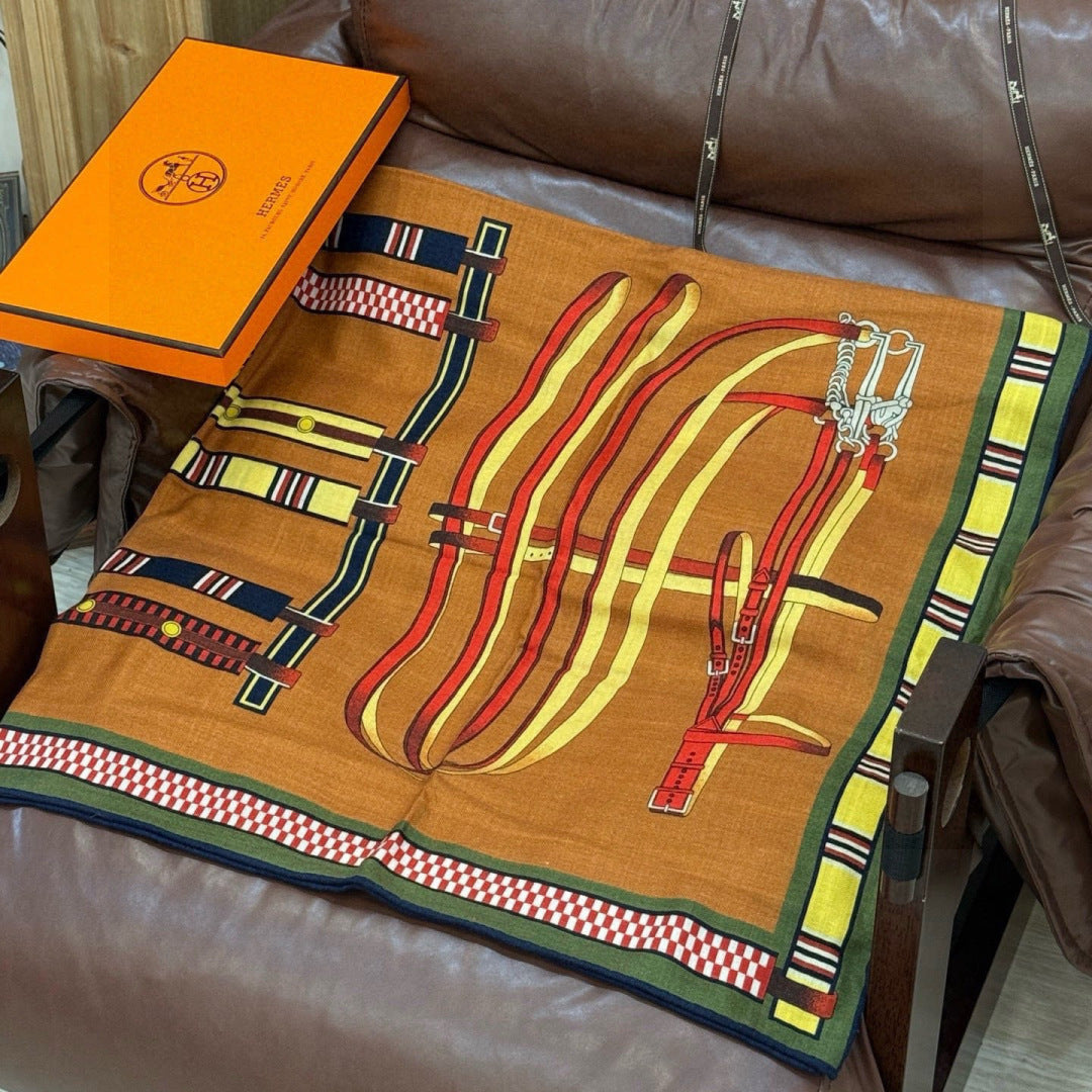 HM 25s Equestrianism Scarf 135cm Camel Brown Blue Cashmere Silk 970963