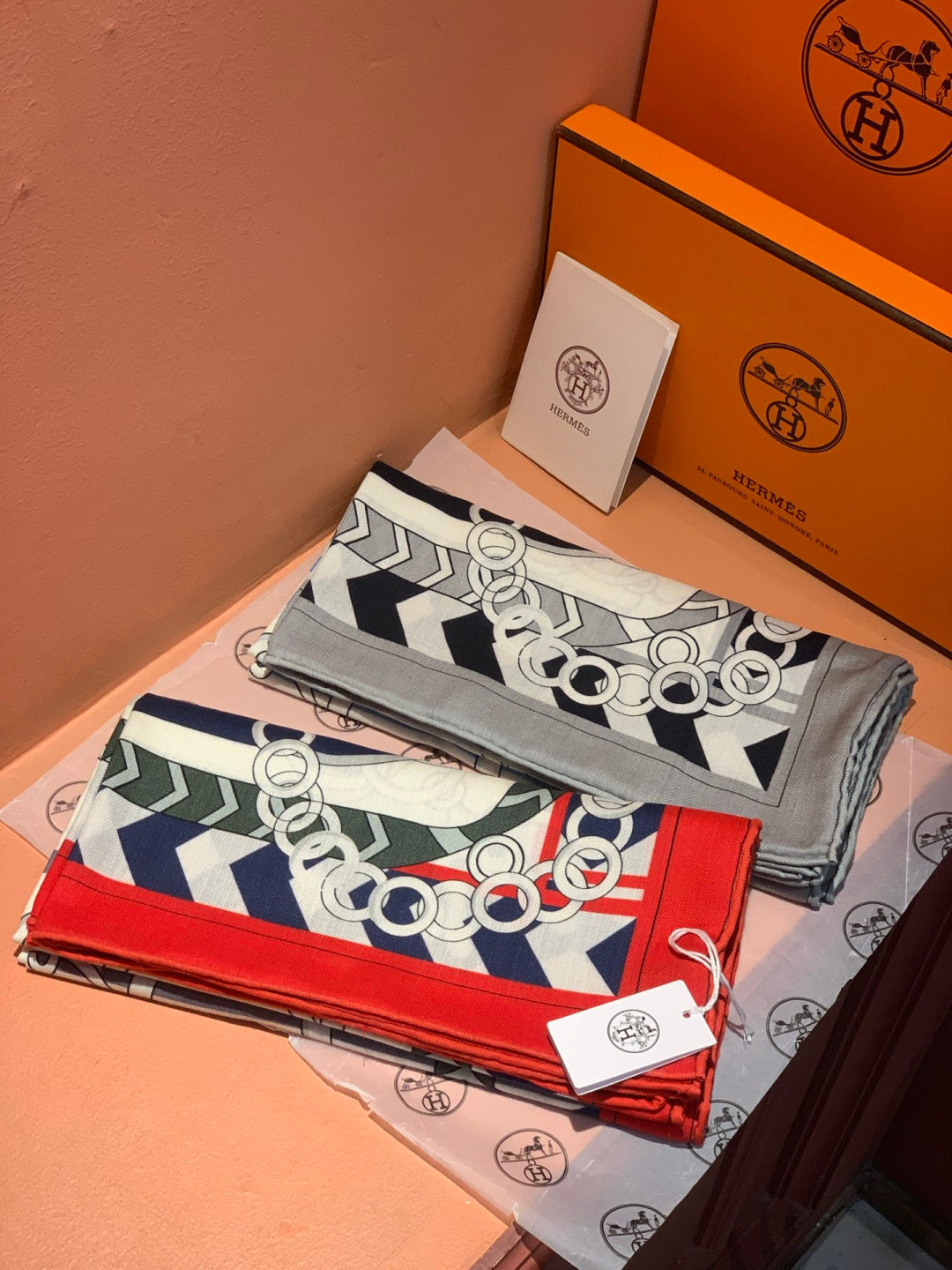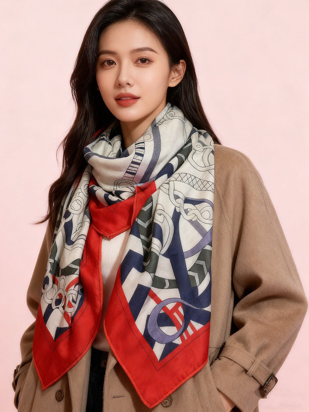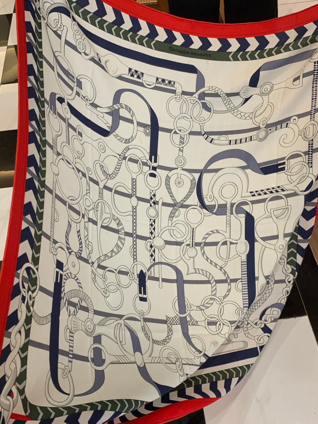 HM 25s Horse Reversible Scarf 140cm White Red Black Cashmere Silk 967387