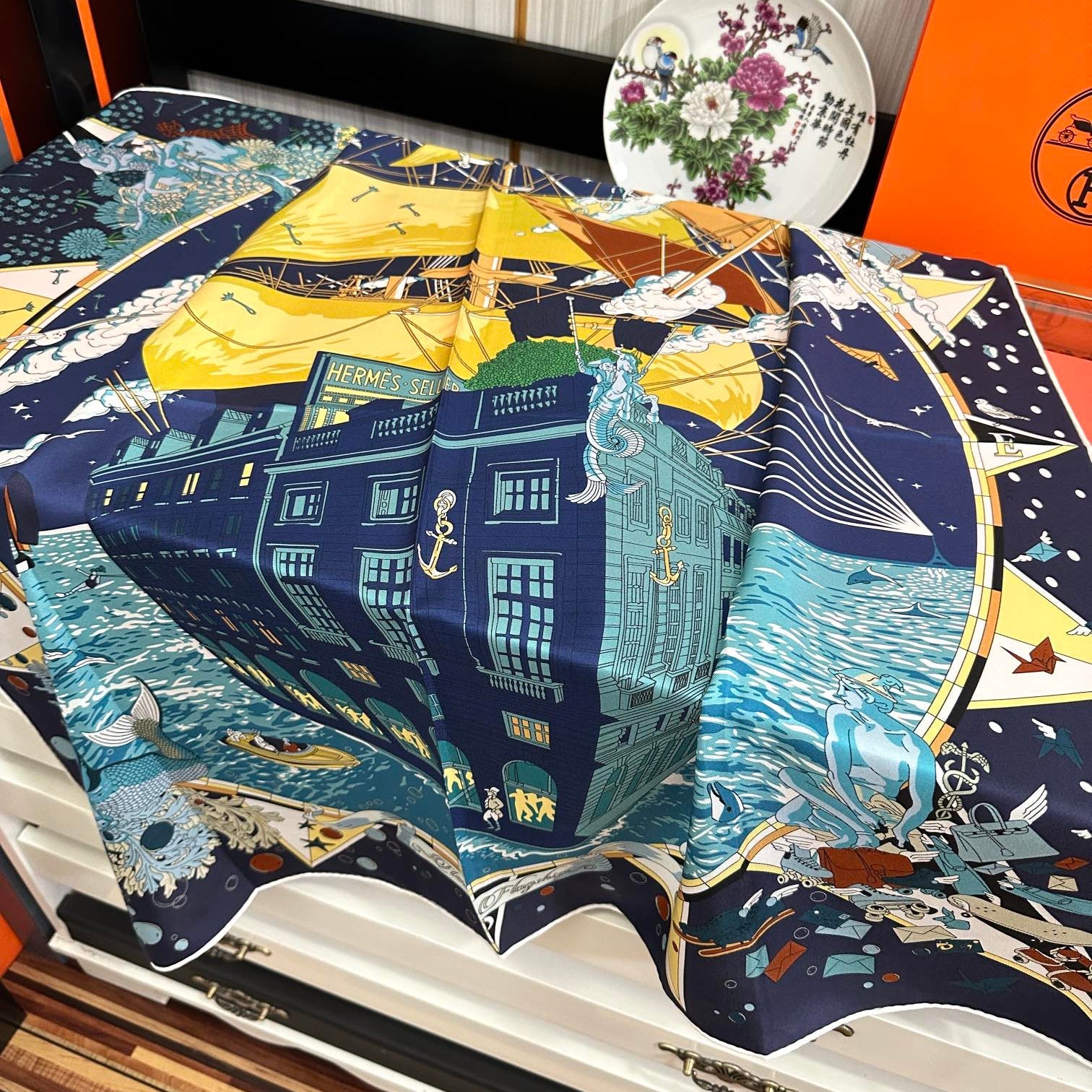 HM 25s Major Scarf 90cm Blue Yellow Cashmere 972936