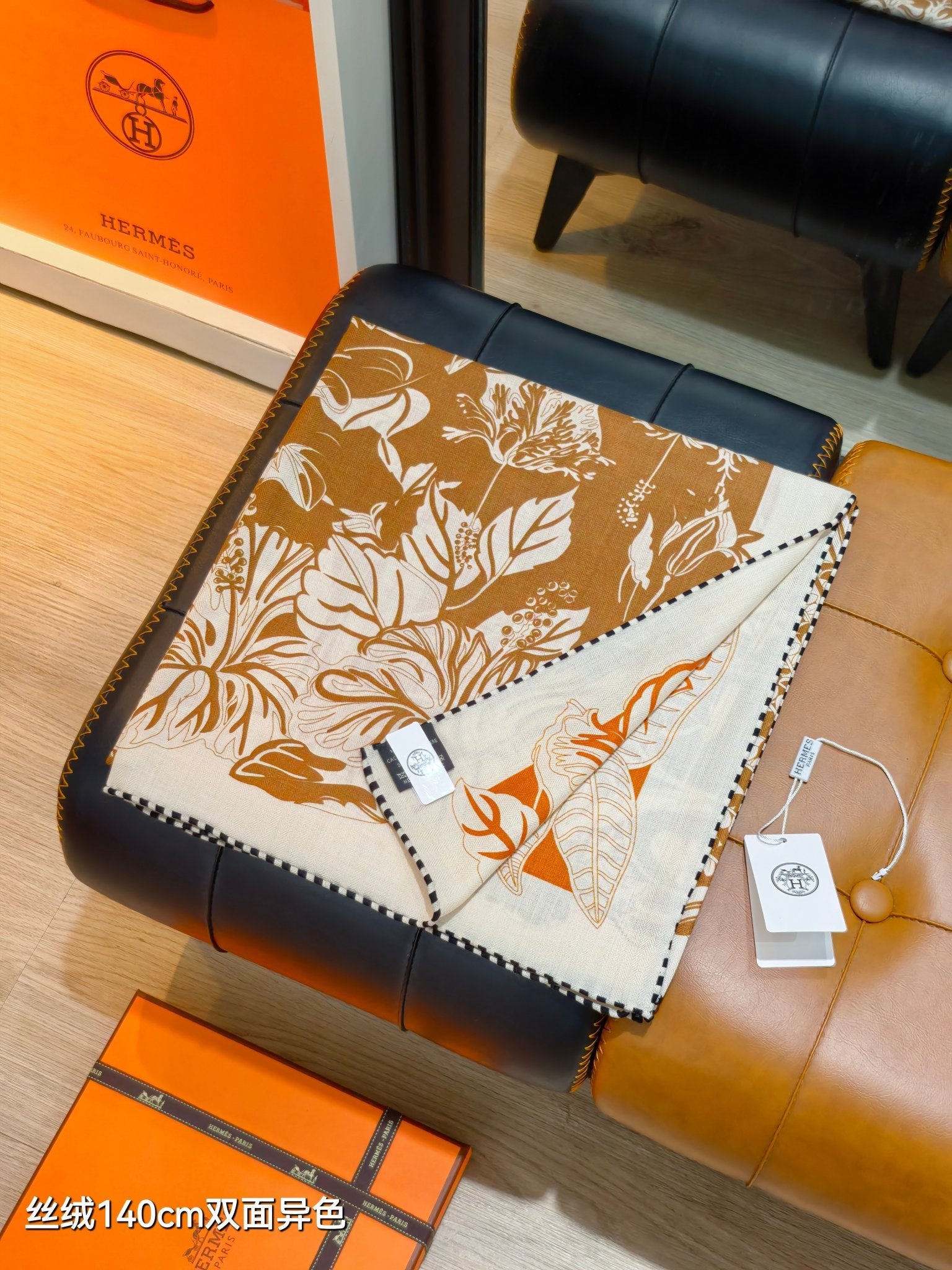 HM 26s Flamingo Party Scarf 140 Orange Brown Cashmere Silk 139241