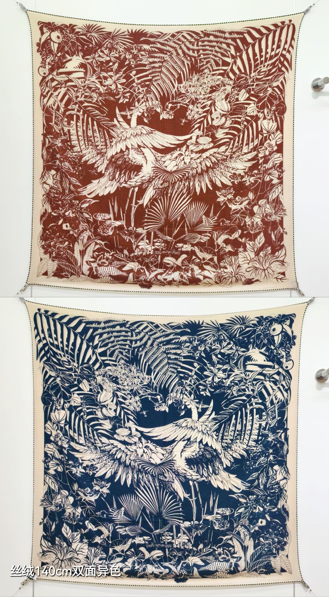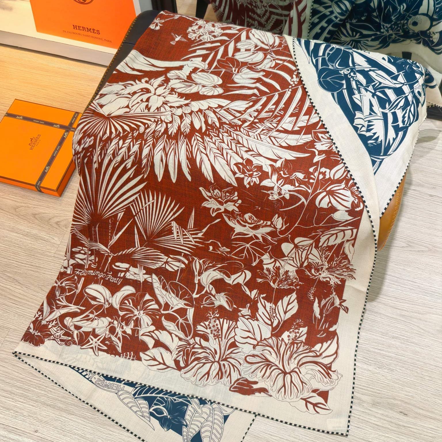 HM 26s Flamingo Party Scarf 140 Terracotta Blue Cashmere Silk 139239