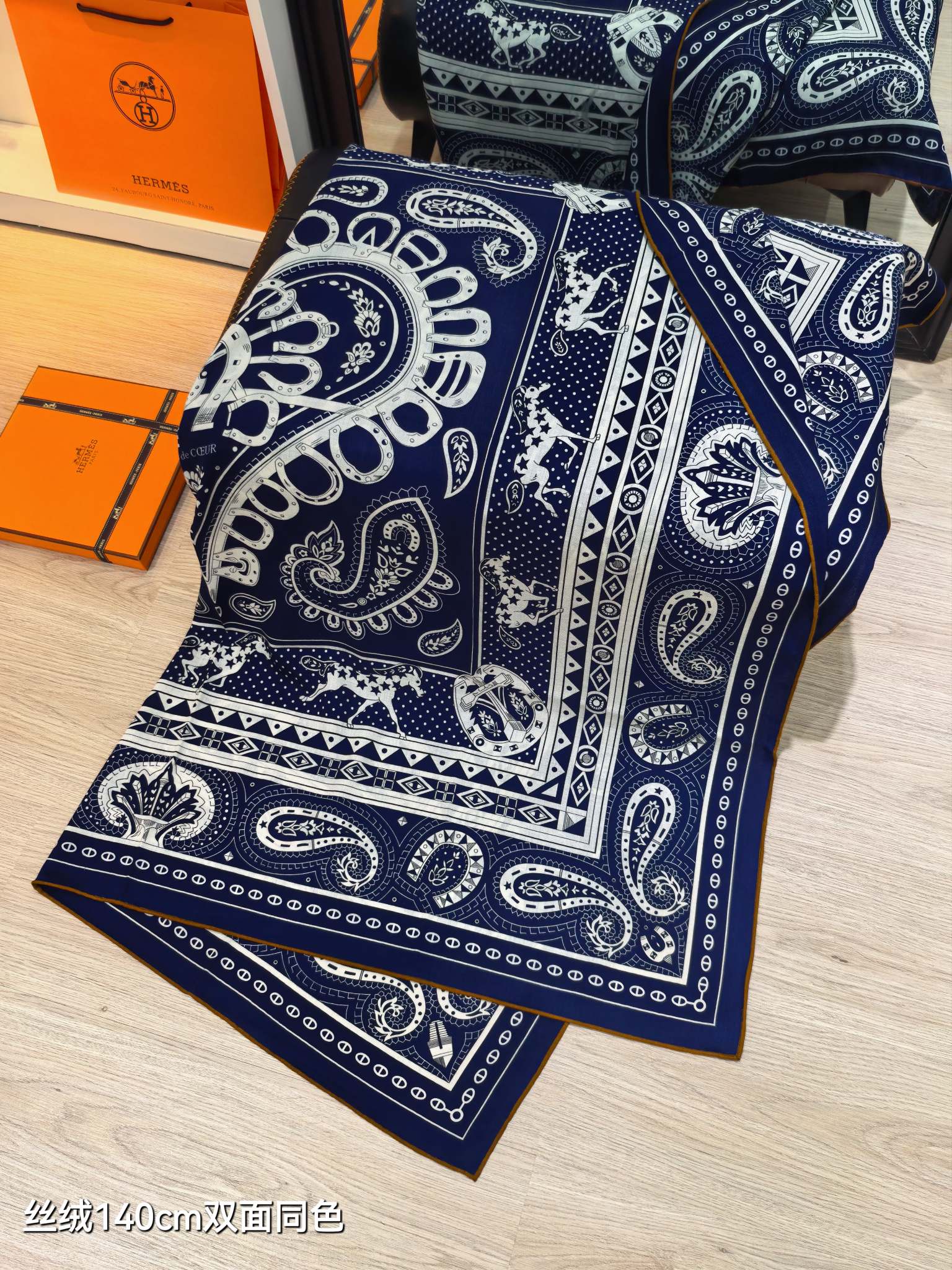 HM 26s Heart Horse Scarf 140 Navy Blue Cashmere Silk 139236