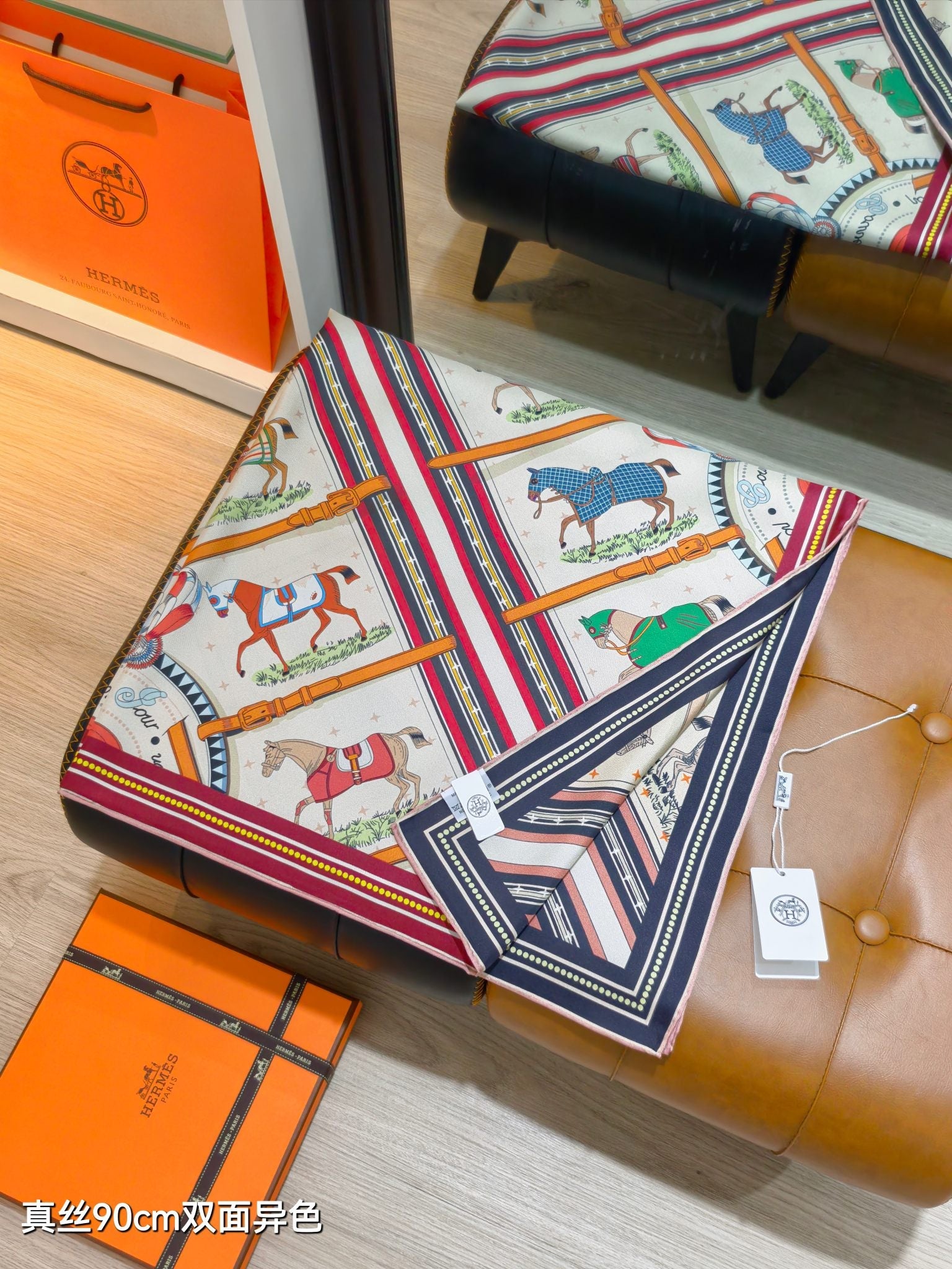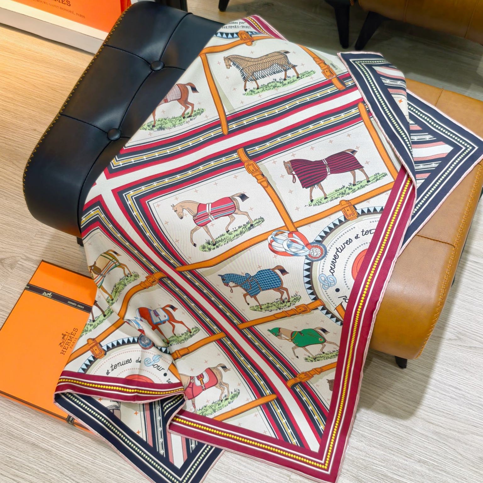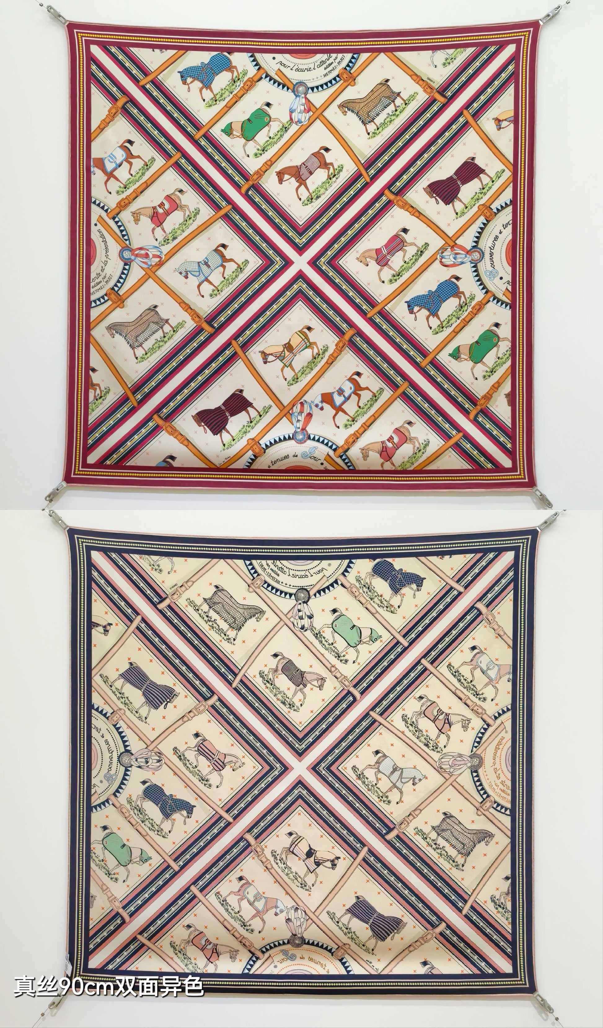 HM 26s Horse Scarf 140 Beige Red Colorful Cashmere Silk 139220