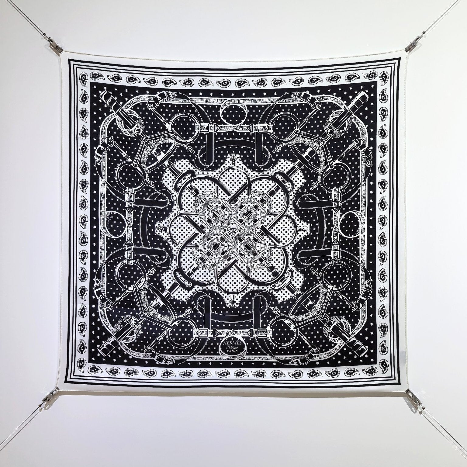 HM 26s Horse Scarf 90 Black White Colorful Cashmere Silk 138045