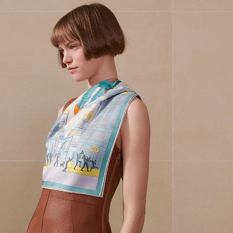 HM 26s Horse Scarf 90 Blue Beige Colorful Cashmere Silk 139215