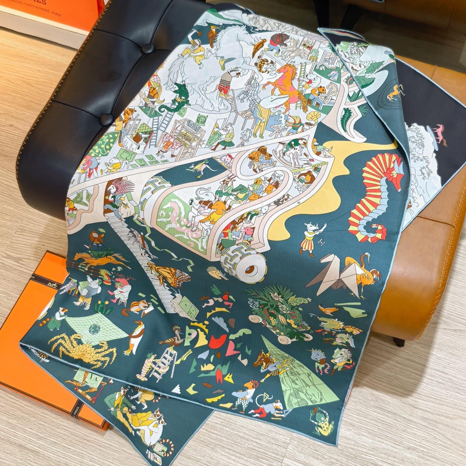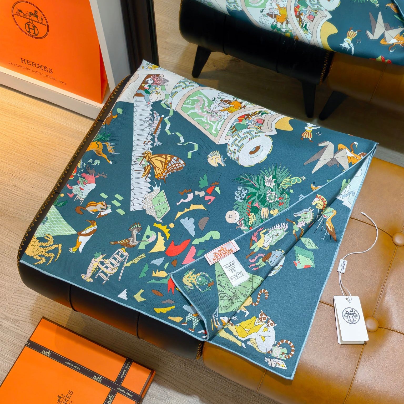 HM 26s Horse Scarf 90 Teal Blue Colorful Cashmere Silk 139216