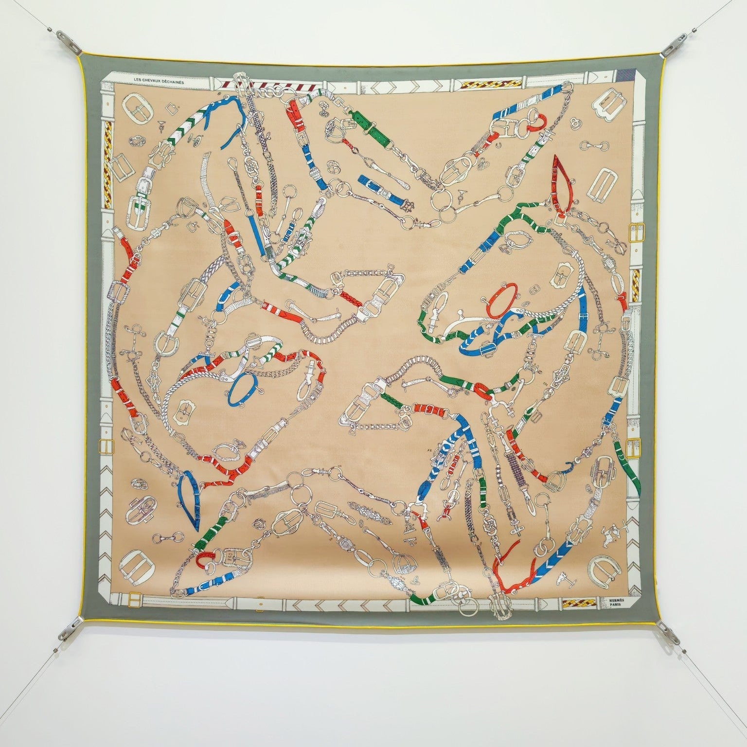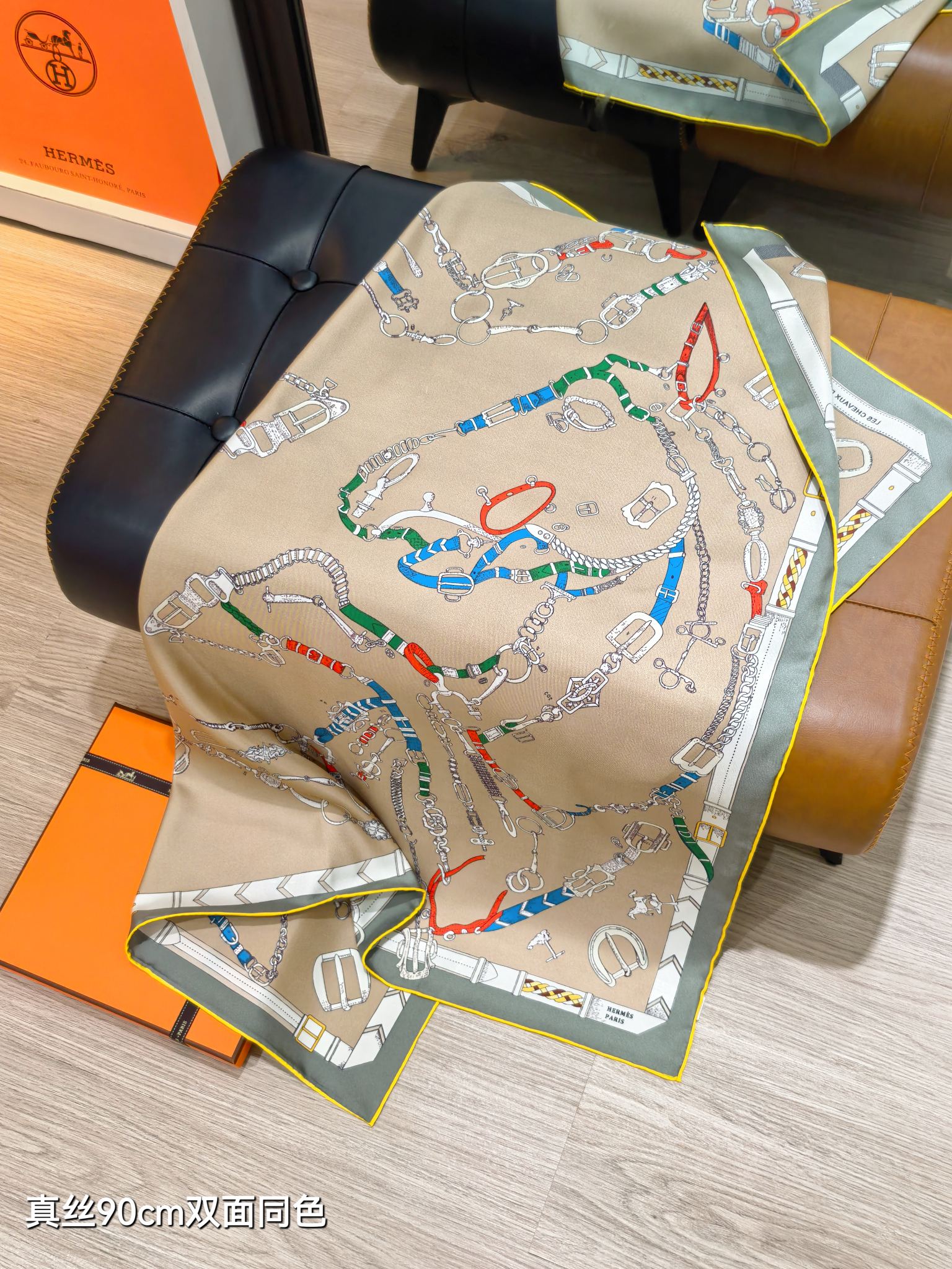 HM 26ss Sweet Saddle Scarf 90 Beige Gray Colorful Twill Silk 132422