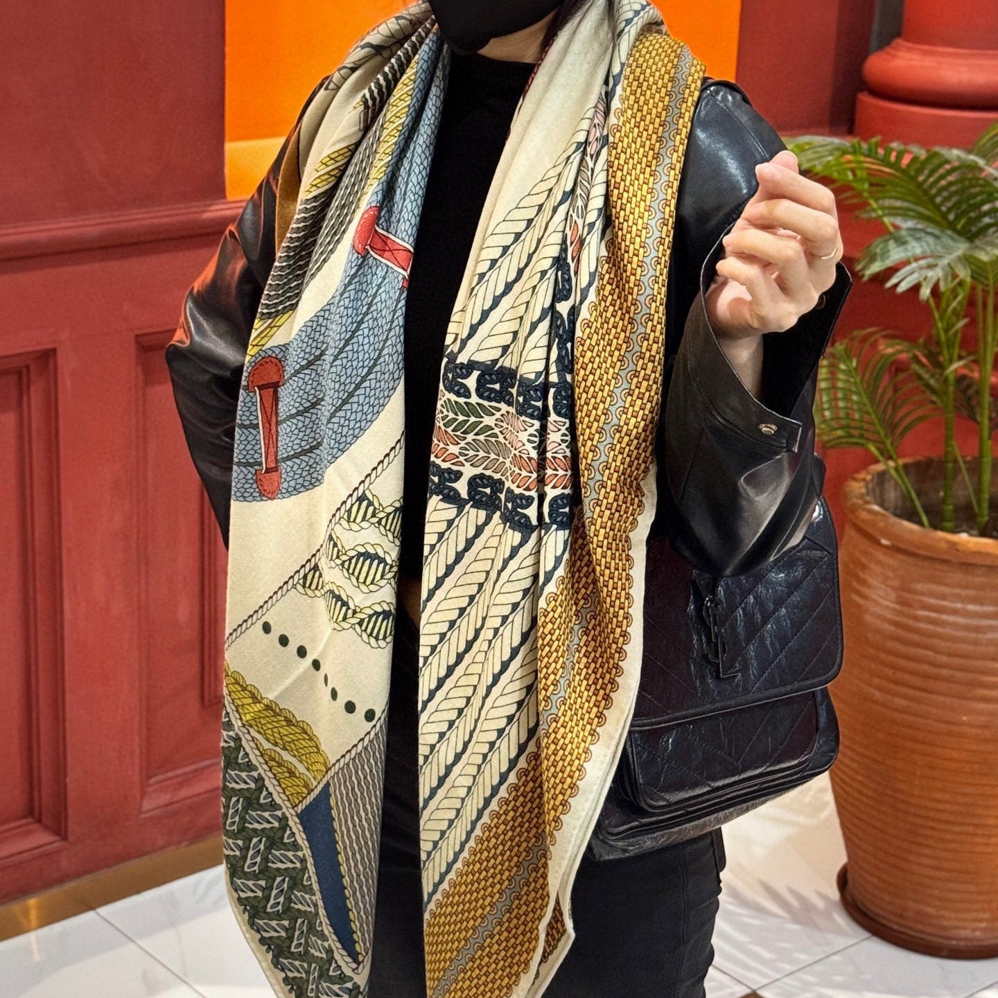HM Dressage Tressage 140 CM Yellow White Colorful Cashmere And Silk 293223