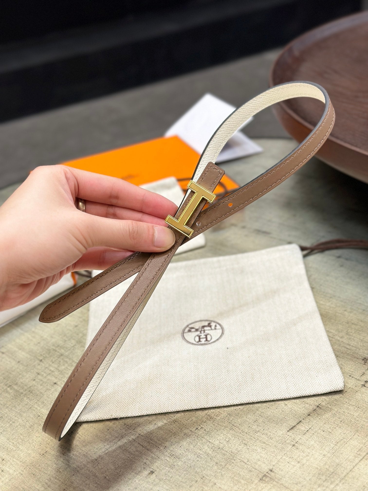 HM FOCUS BUCKLE & REVERSIBLE PEANUT BROWN AND WHITE LEATHER STRAP 13MM GOLD HARDWARE