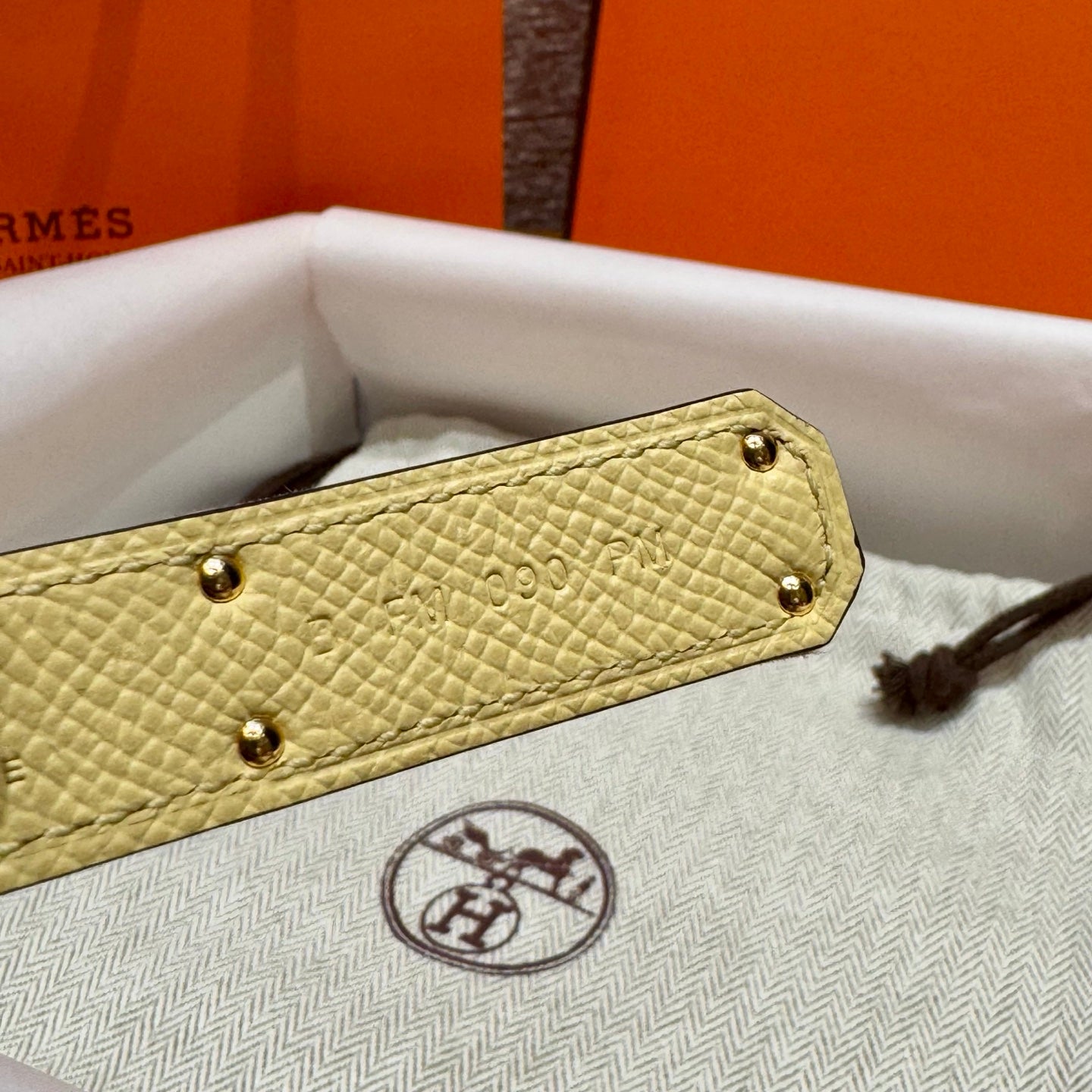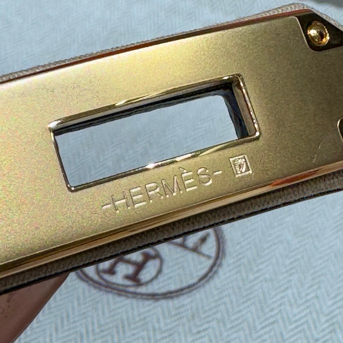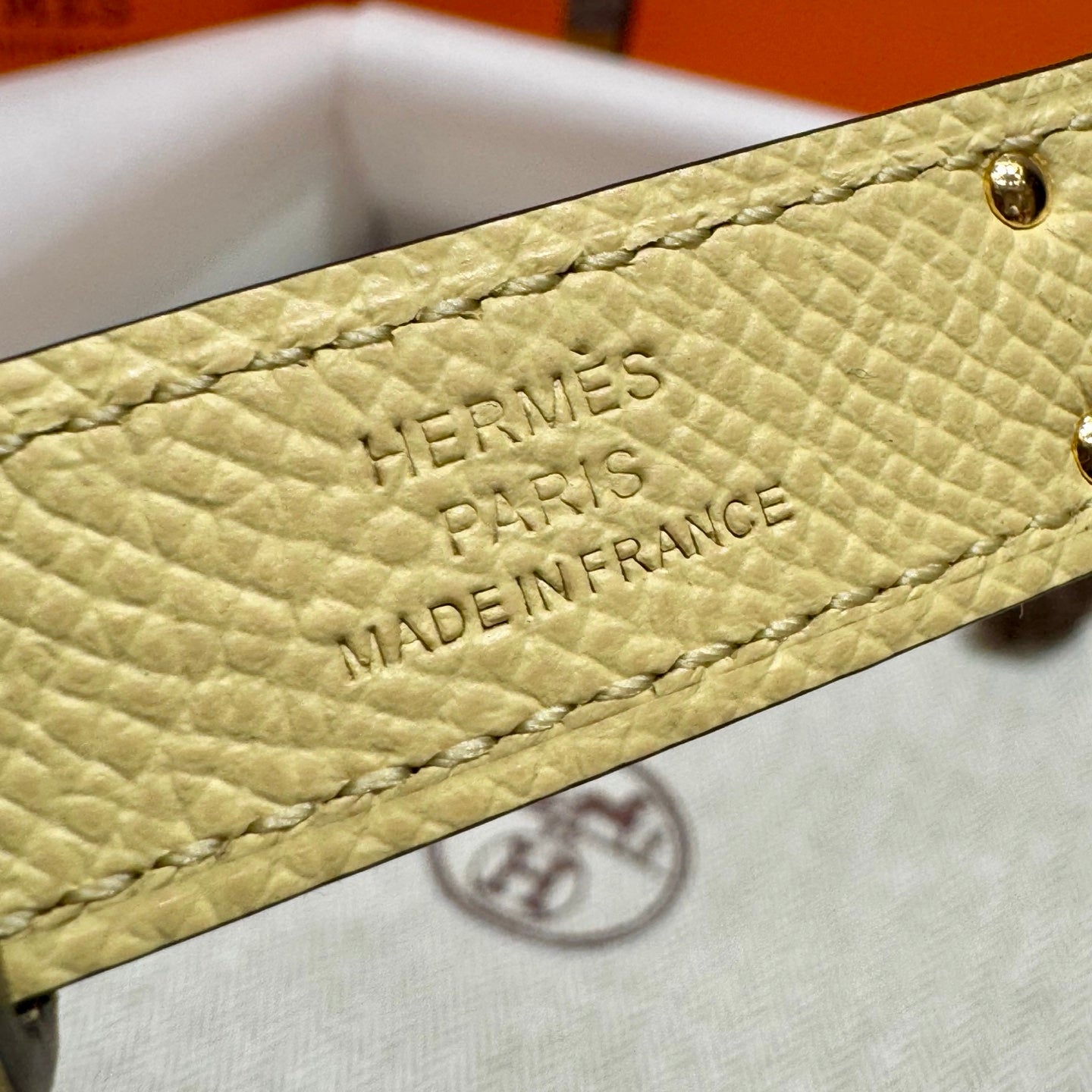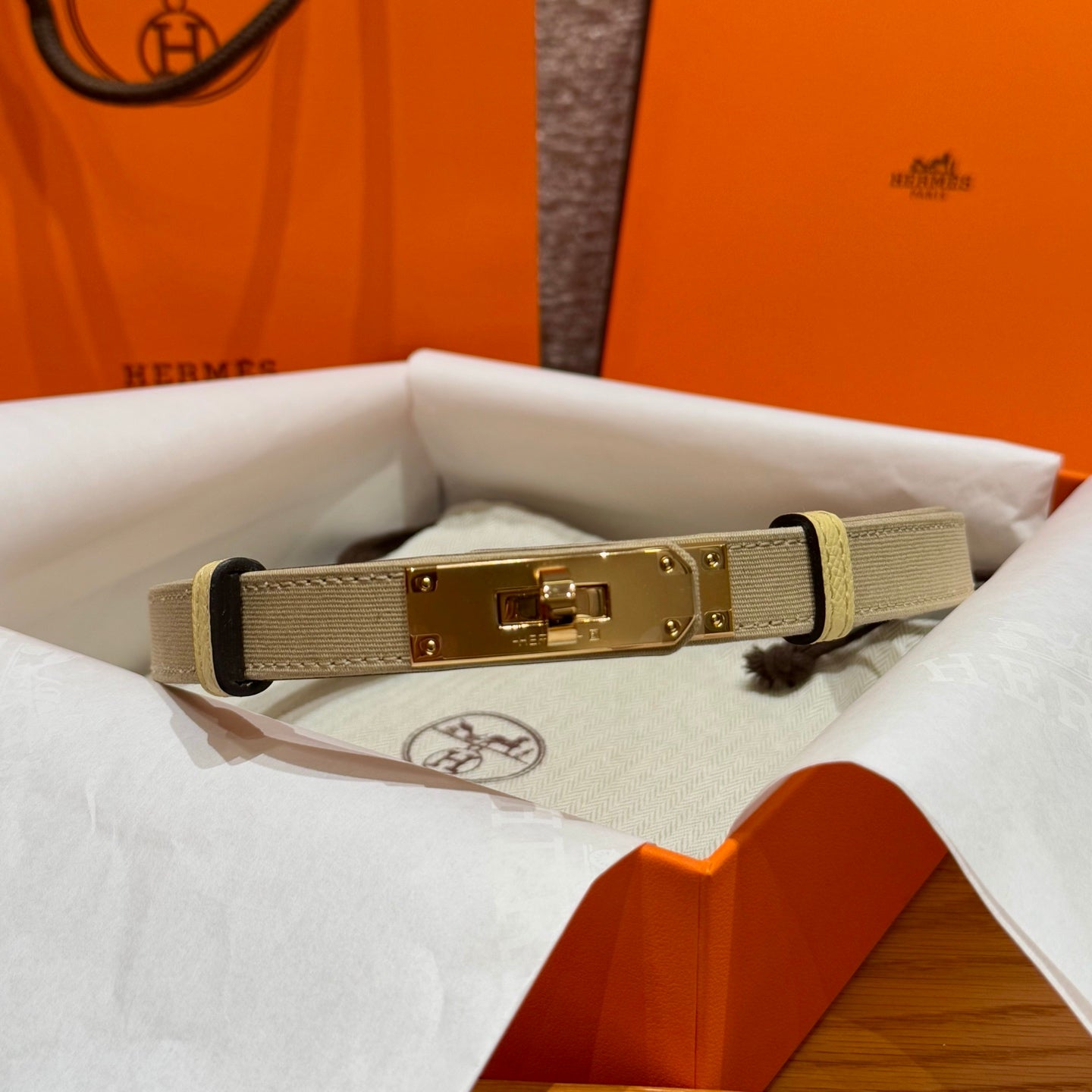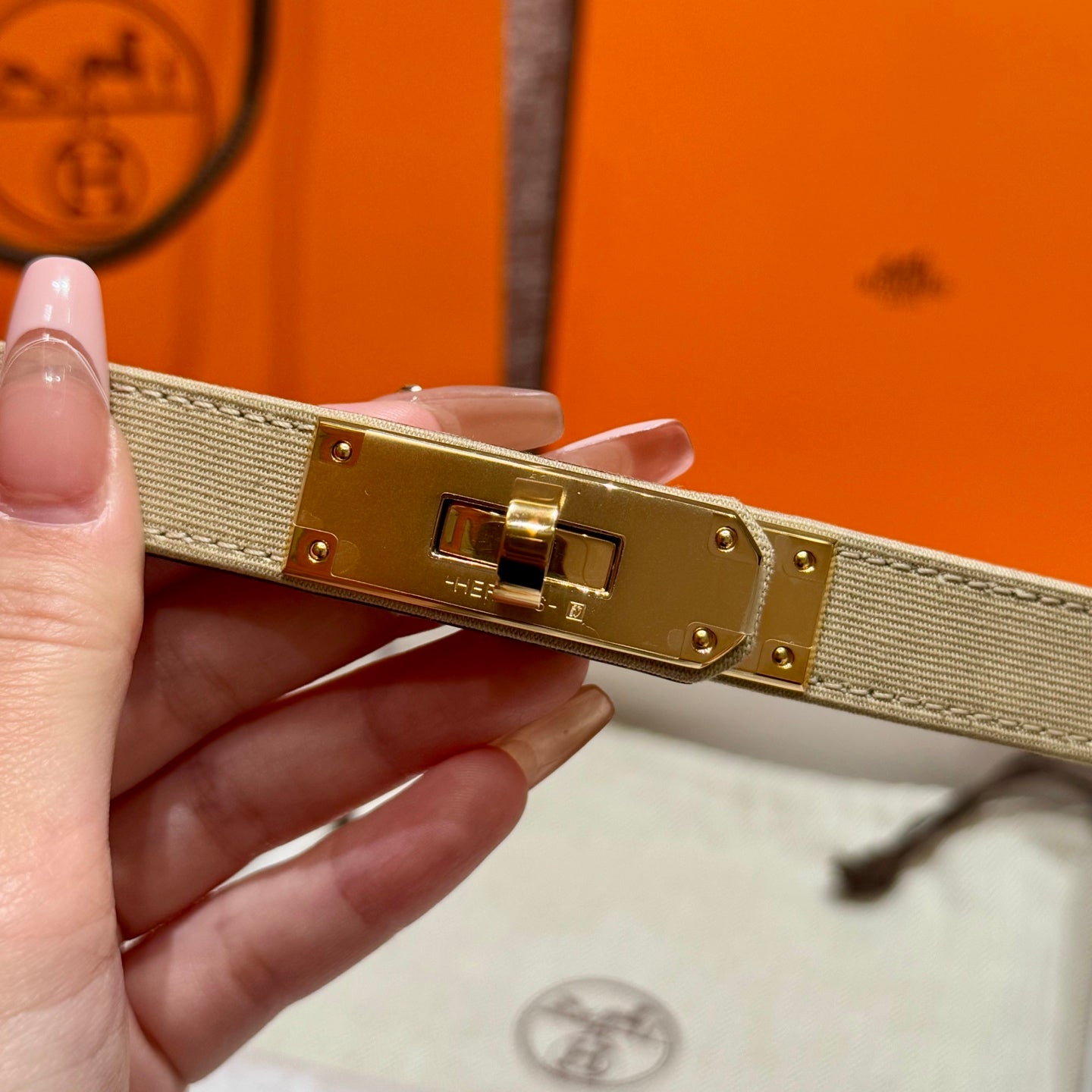 HM Kelly Belt 18mm Beige Canvas Epsom Leather Gold Buckle