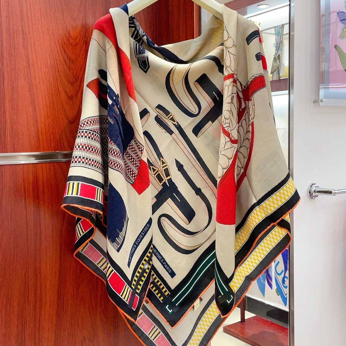 HM Lettres Equestre Scarf 140 CM In White Colorful Cashmere And Silk 359399