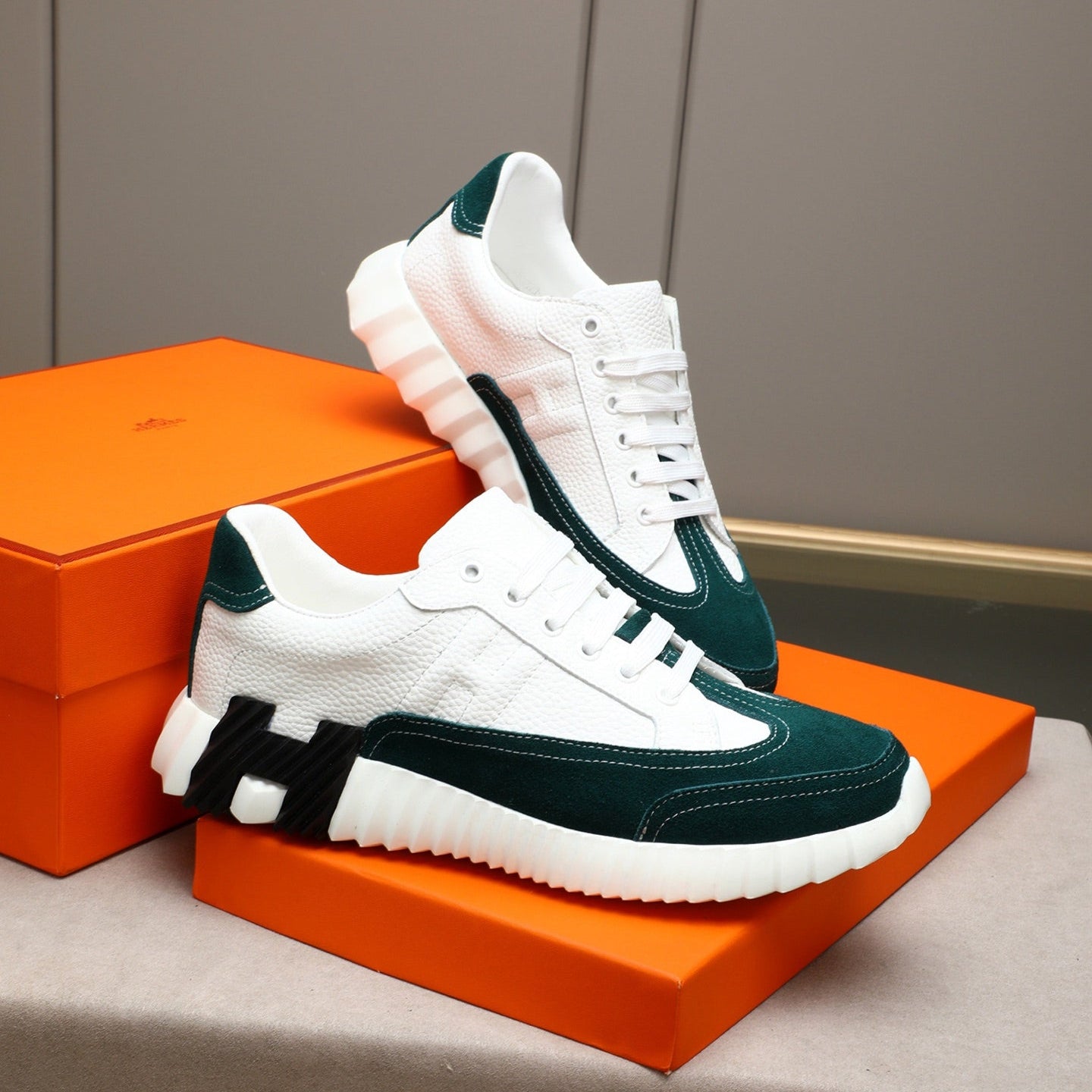 HM Men's Bouncing Sneakers White Green Sheepskin Suede 664382