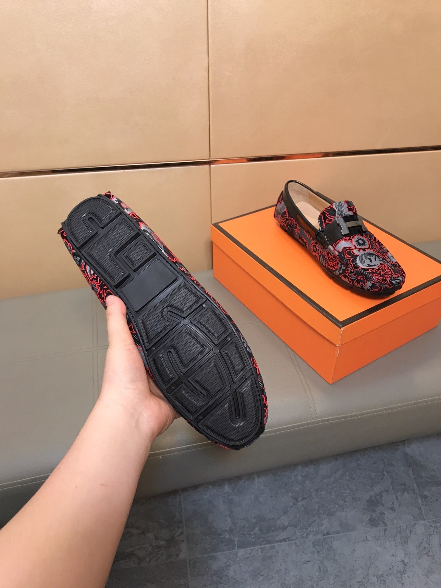 HM Men's Flower Loafer Red Black Printed Fabric Pigskin 685514