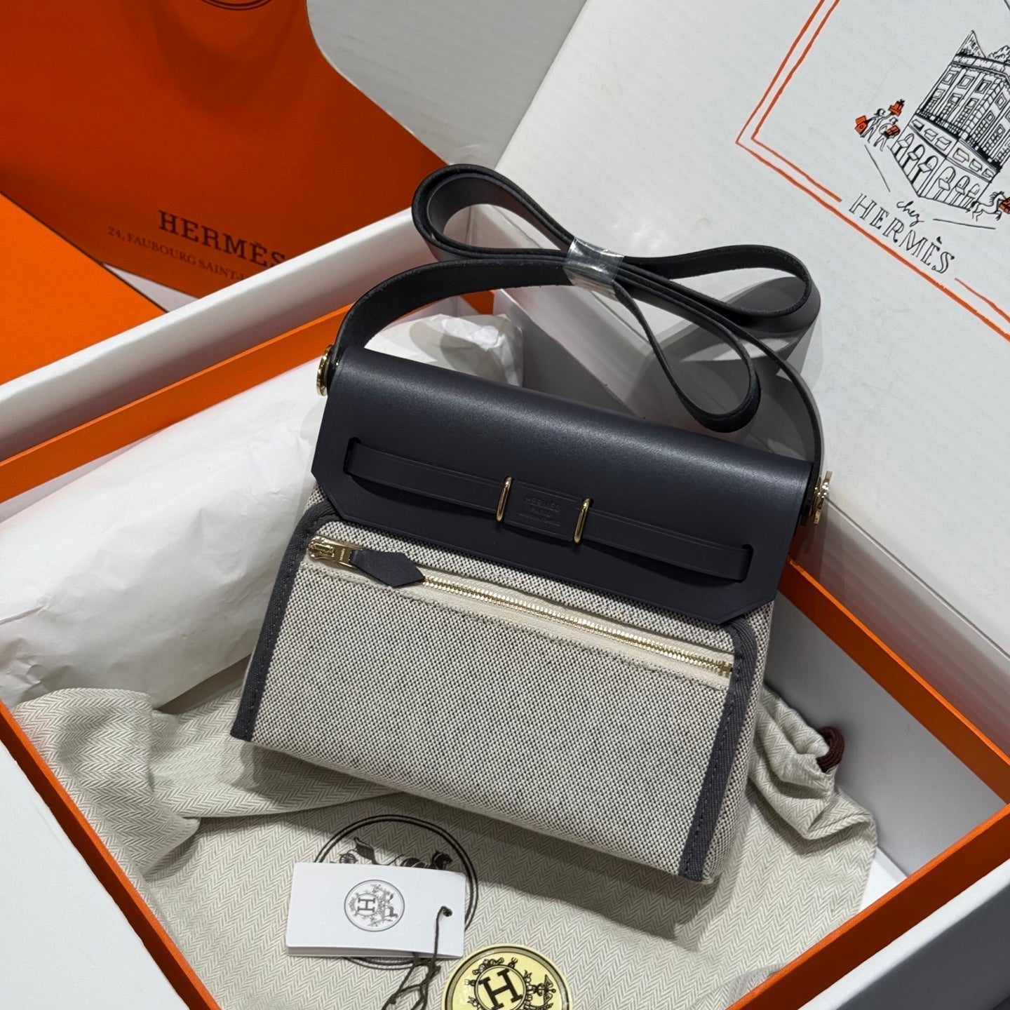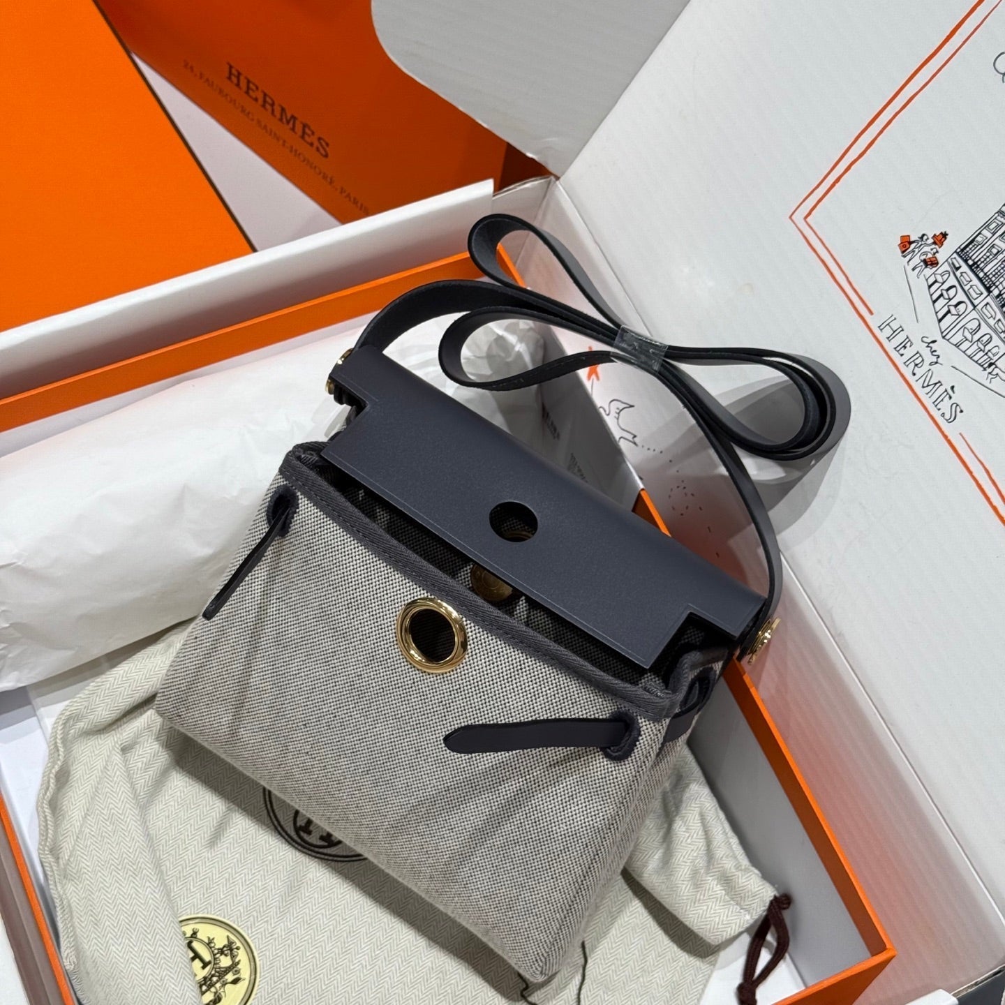 HM Mini Herbag Gold Buckle 20 Beige Grey Canvas and Hunter Cowhide 243285