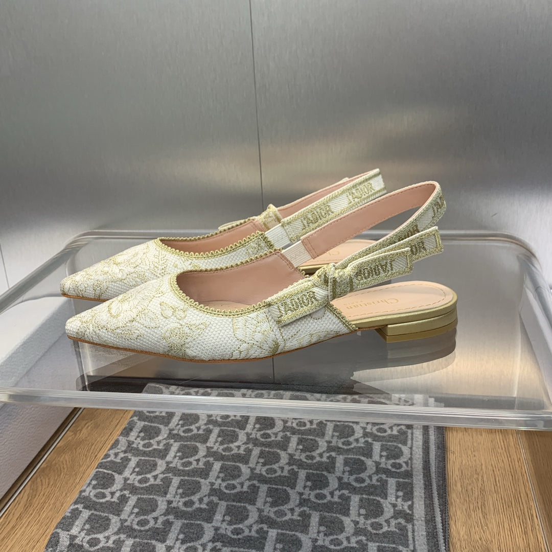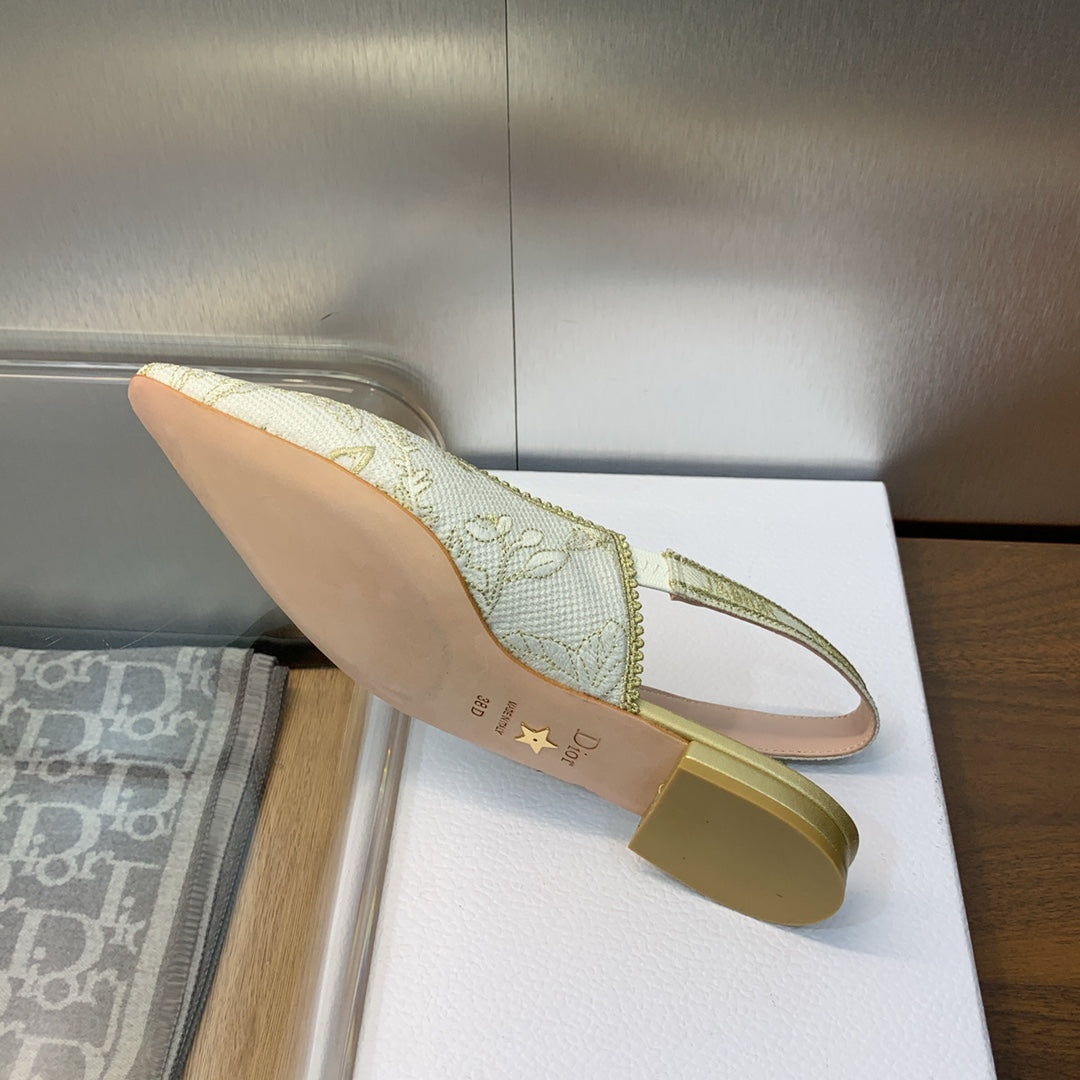 JAdior Slingback Flat White and Gold-Tone Toile de Jouy Mexico Embroidered Cotton with Metallic Thread