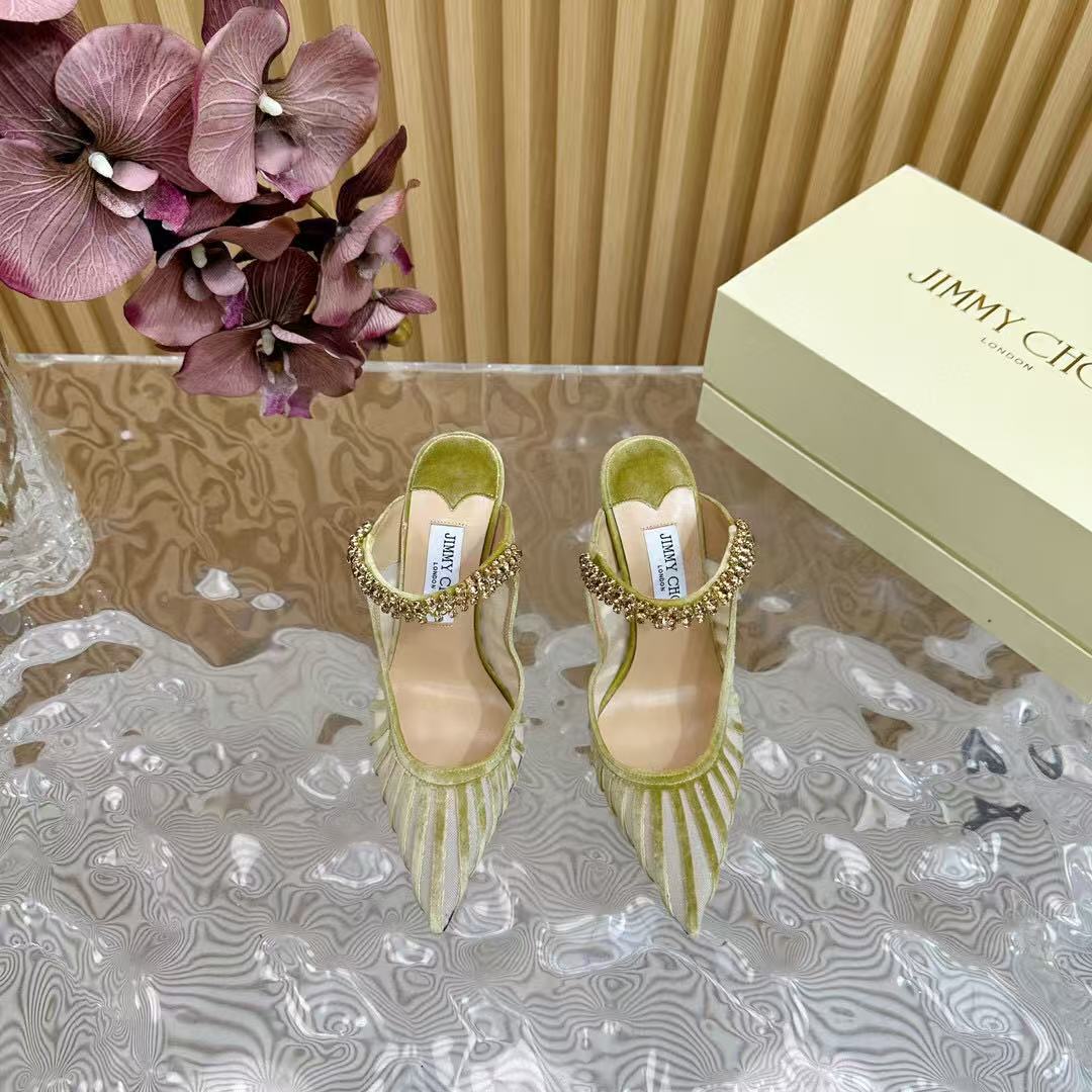 Jimmy Choo 2025 Flocked Velvet Striped Yellow Mesh Bing 100 Pumps With Crystals