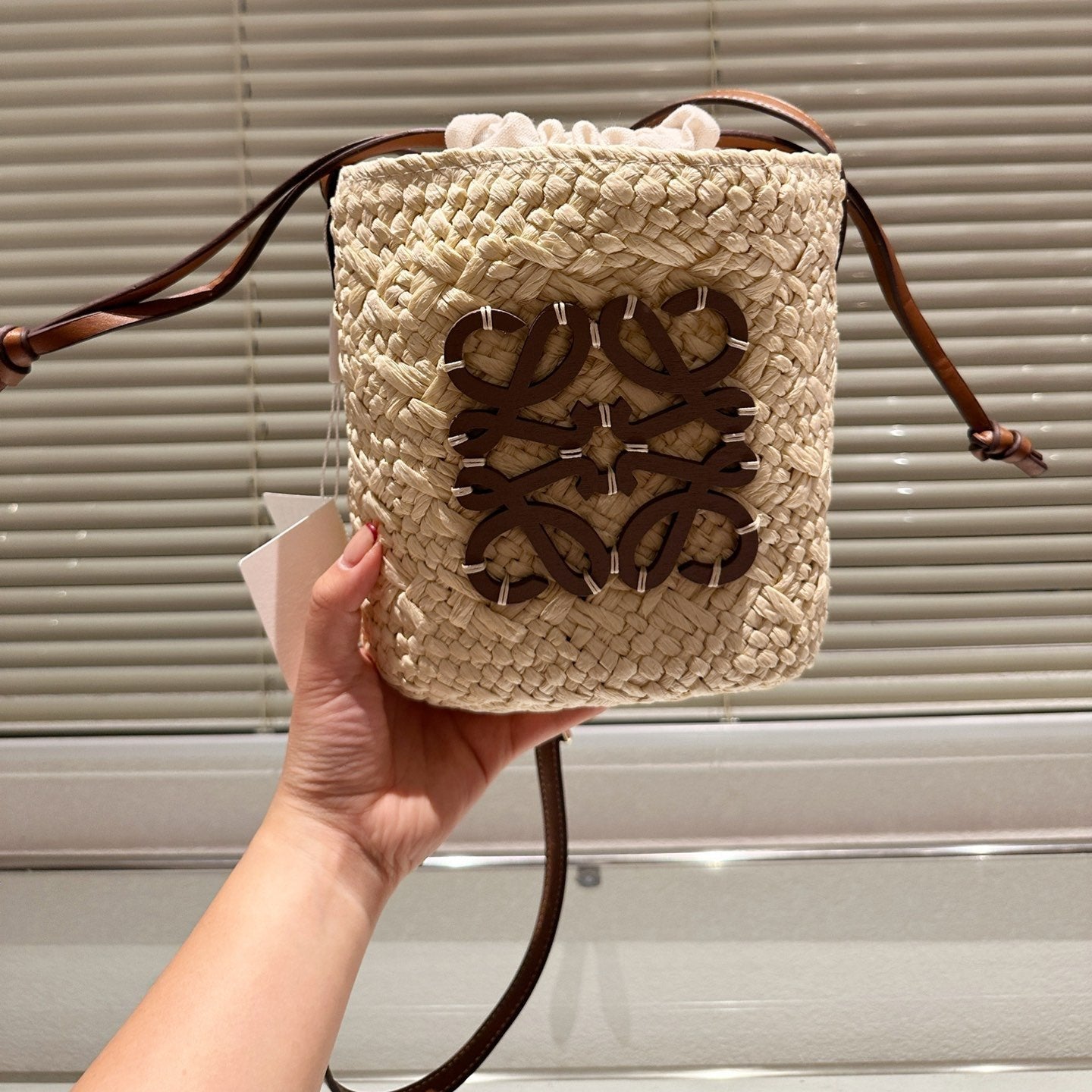 LOE ANAGRAM MINI 18 BUCKET BAG IN NATURAL RAFFIA