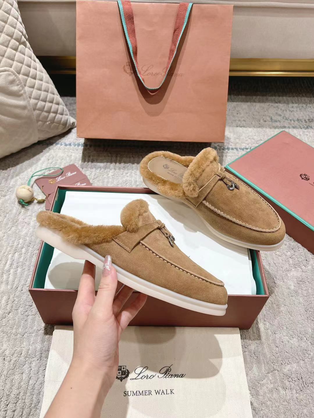 LP Charms Walk Babouche Loafer Marigold Brown Suede With Rabbit Fur Lining 206232