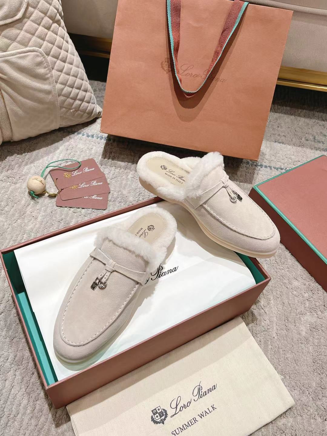 LP Charms Walk Babouche Loafer White Suede With Rabbit Fur Lining 206231