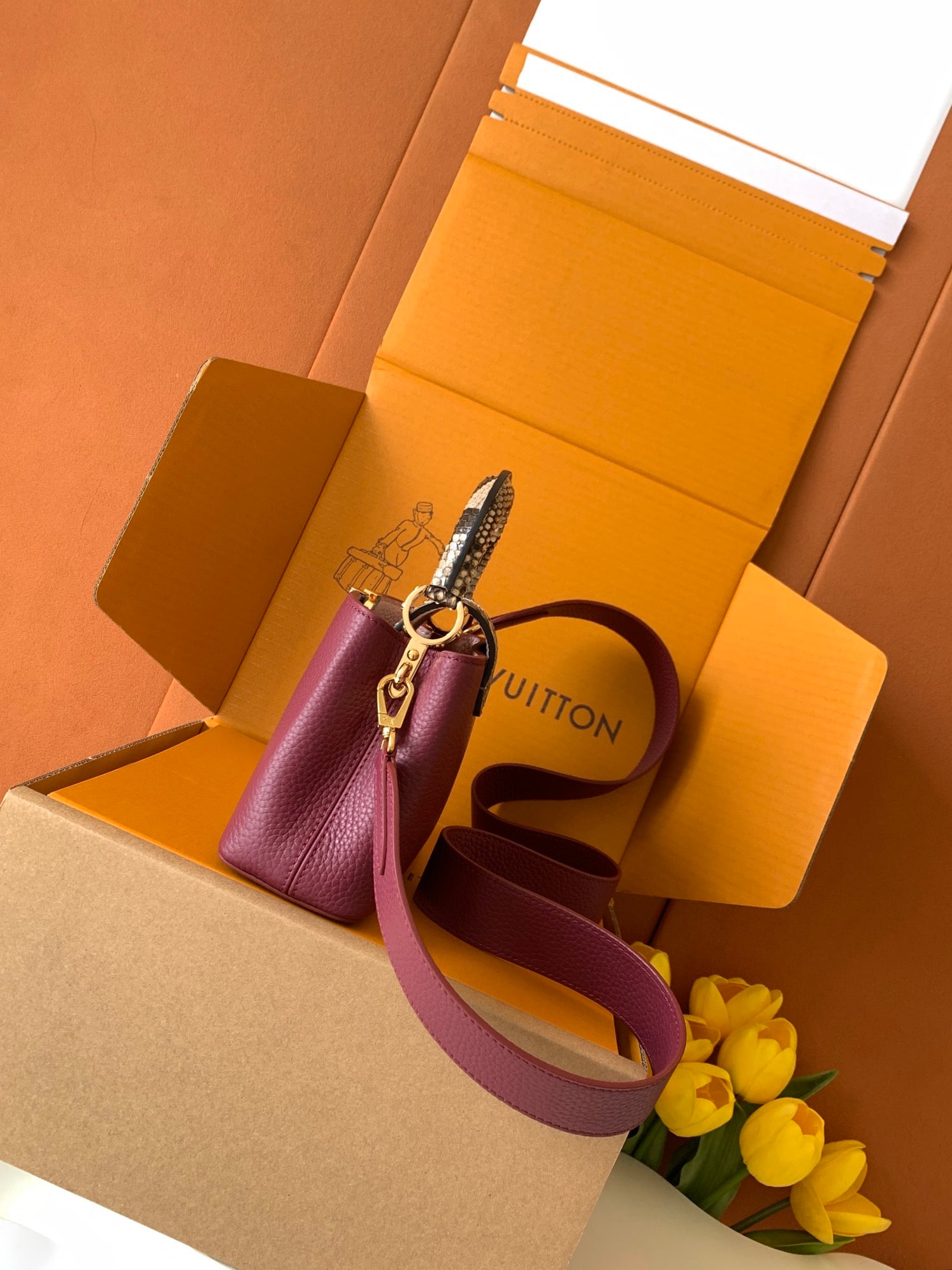 LV 2026 Burgundy Taurillon Leather And Python Mini Capucines Bag