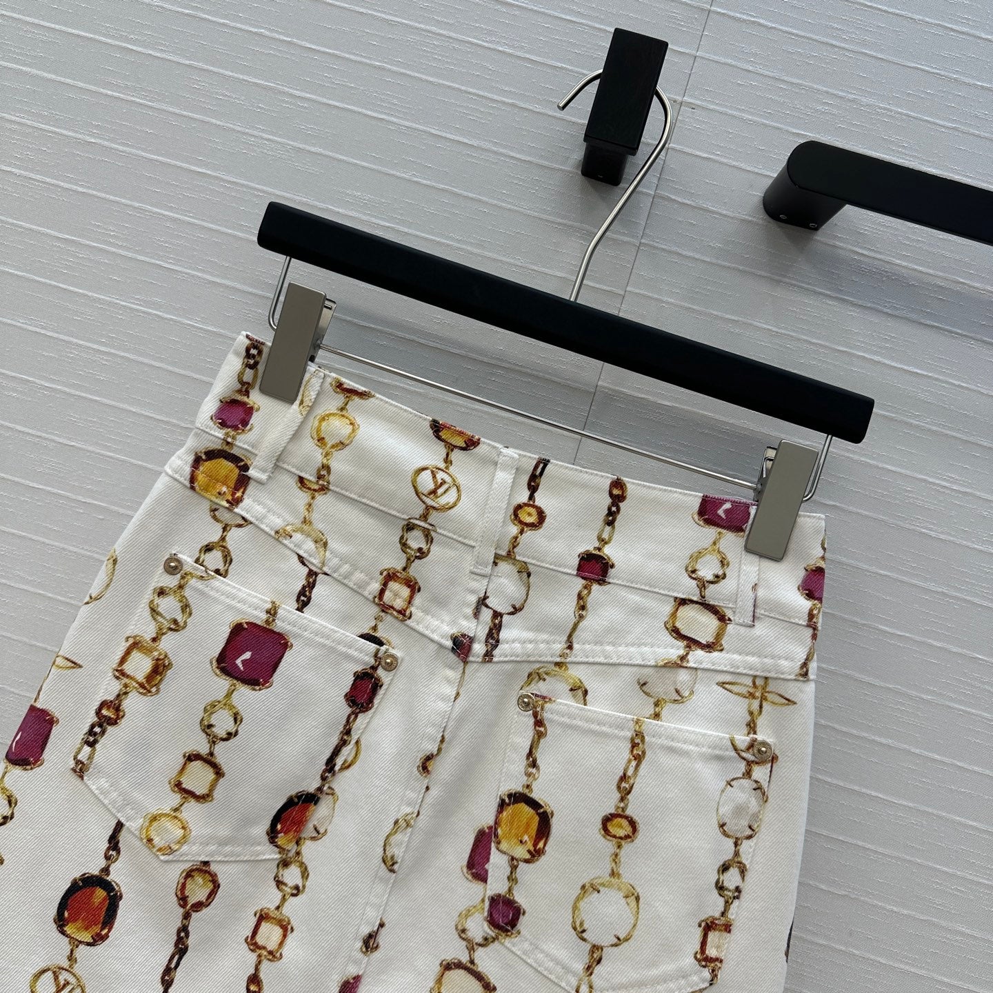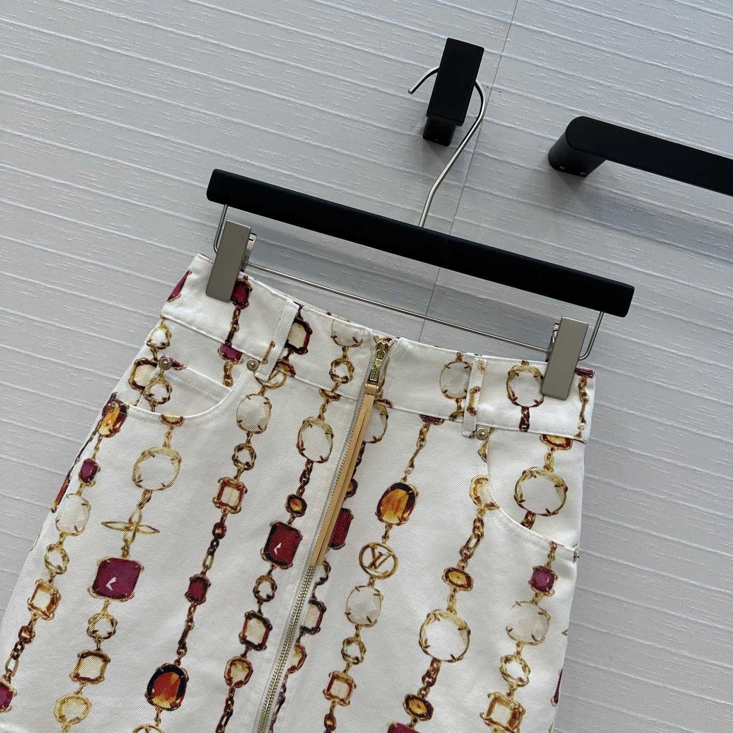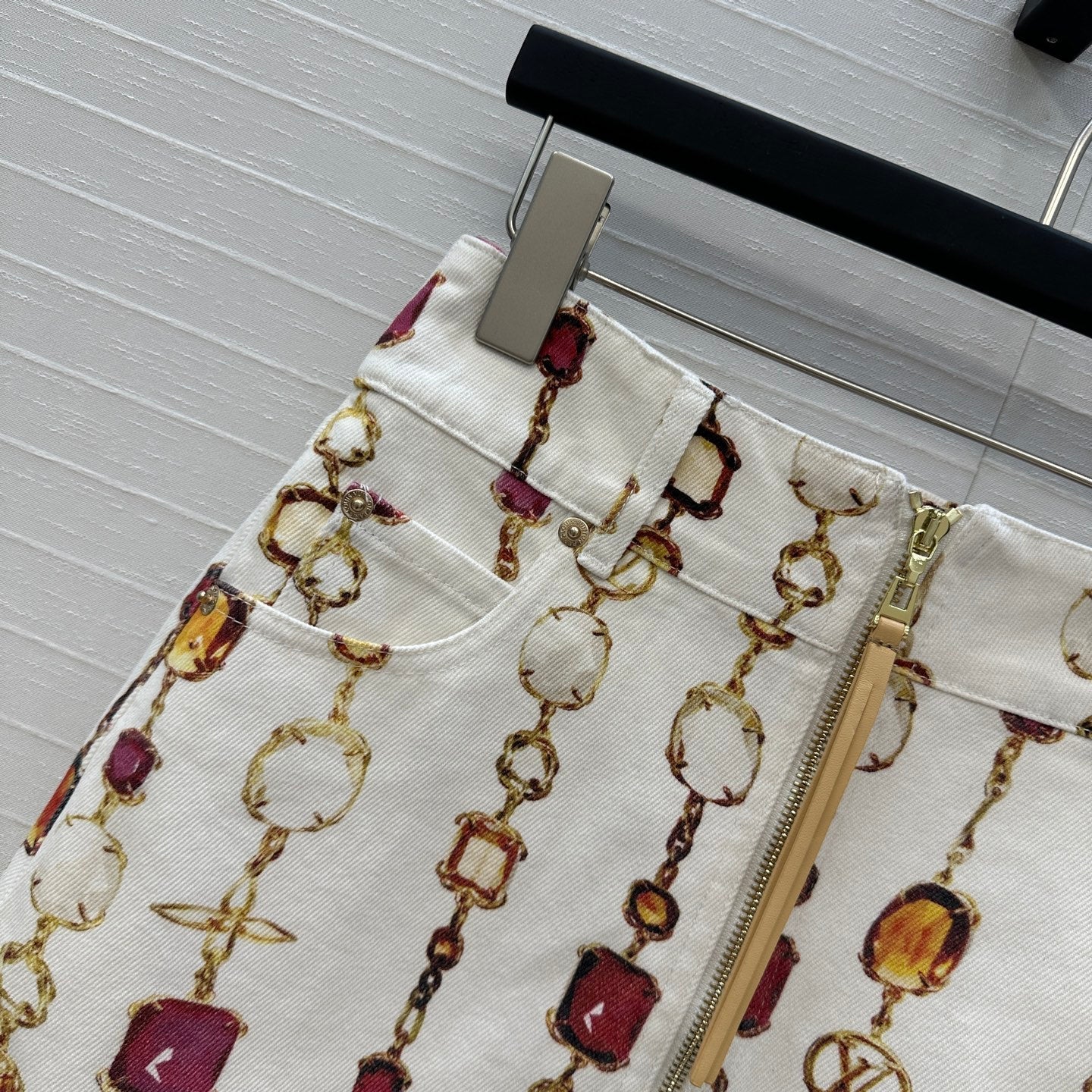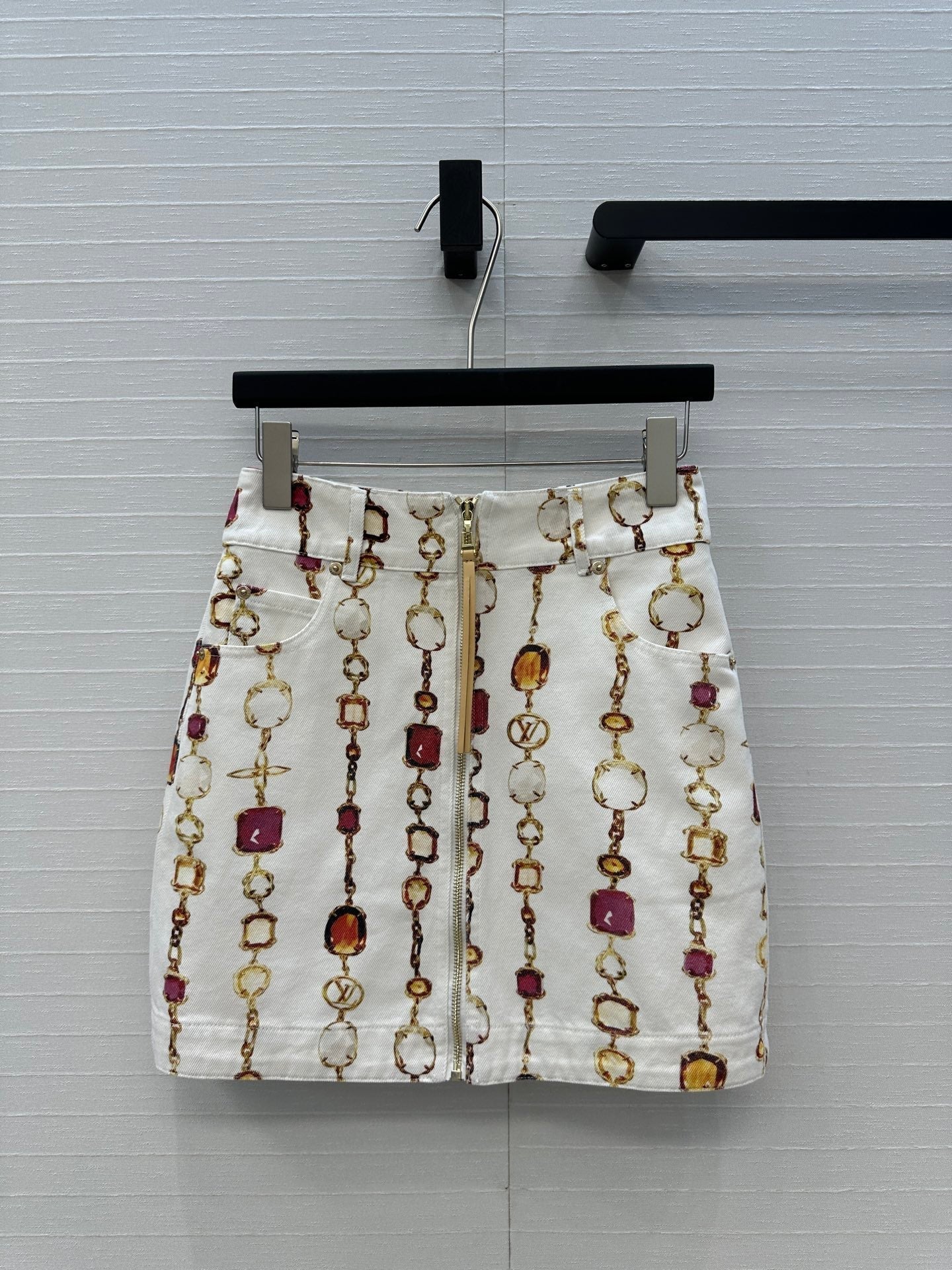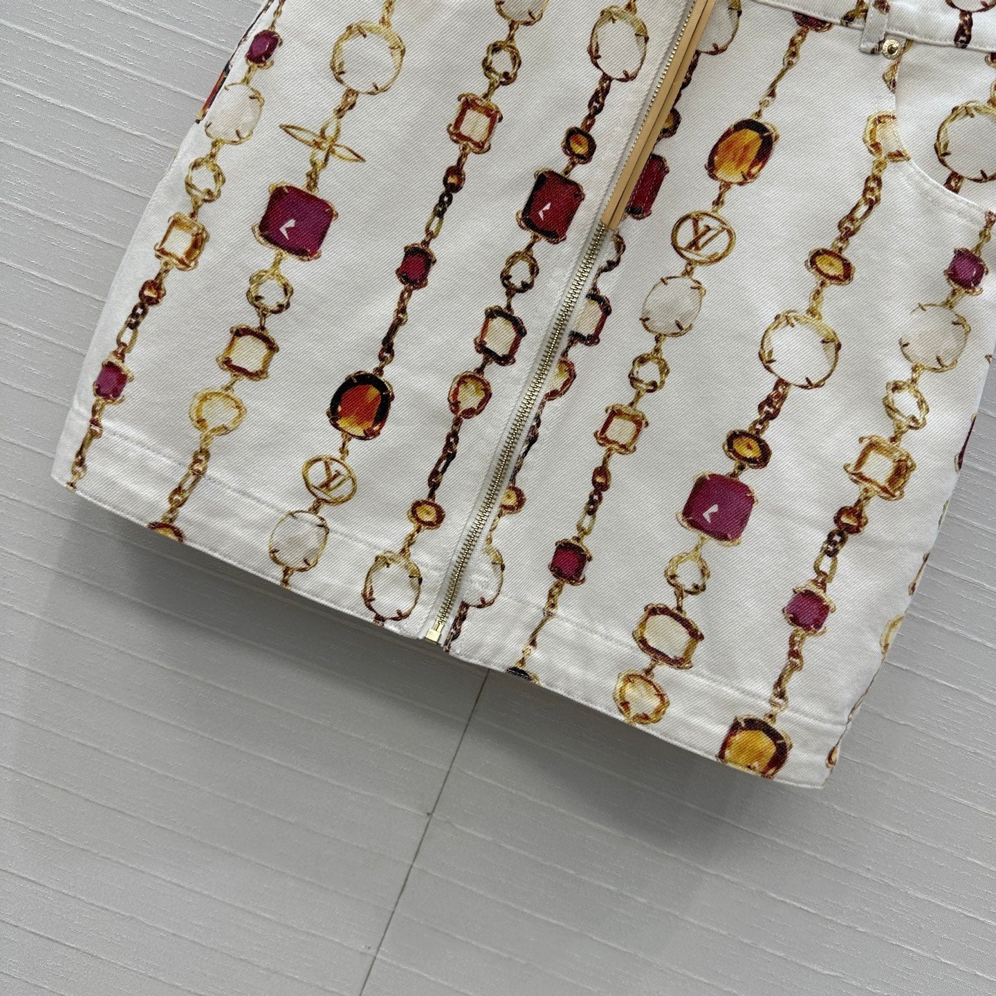 LV 25 Bourgoise Series Printed Zipper Denim Skirt White Cotton
