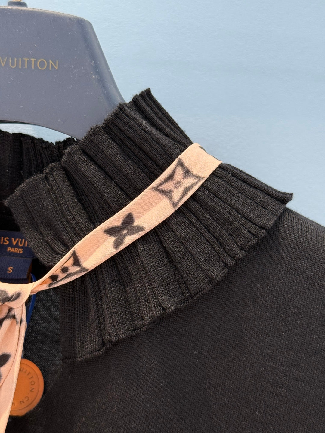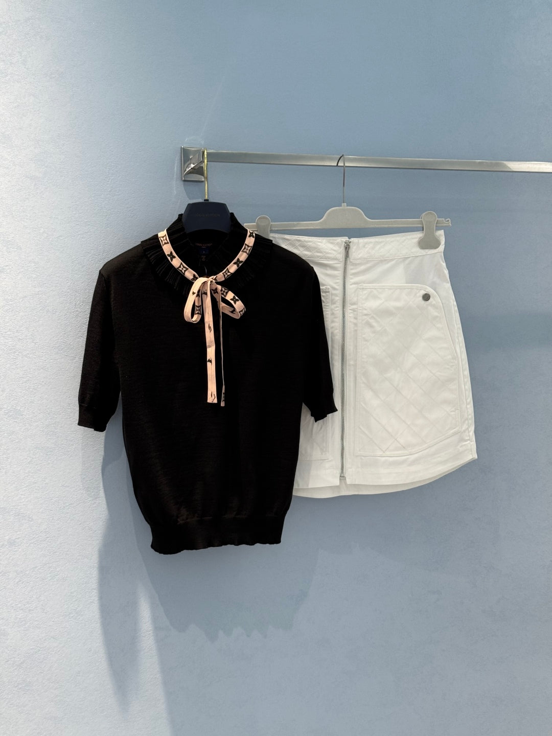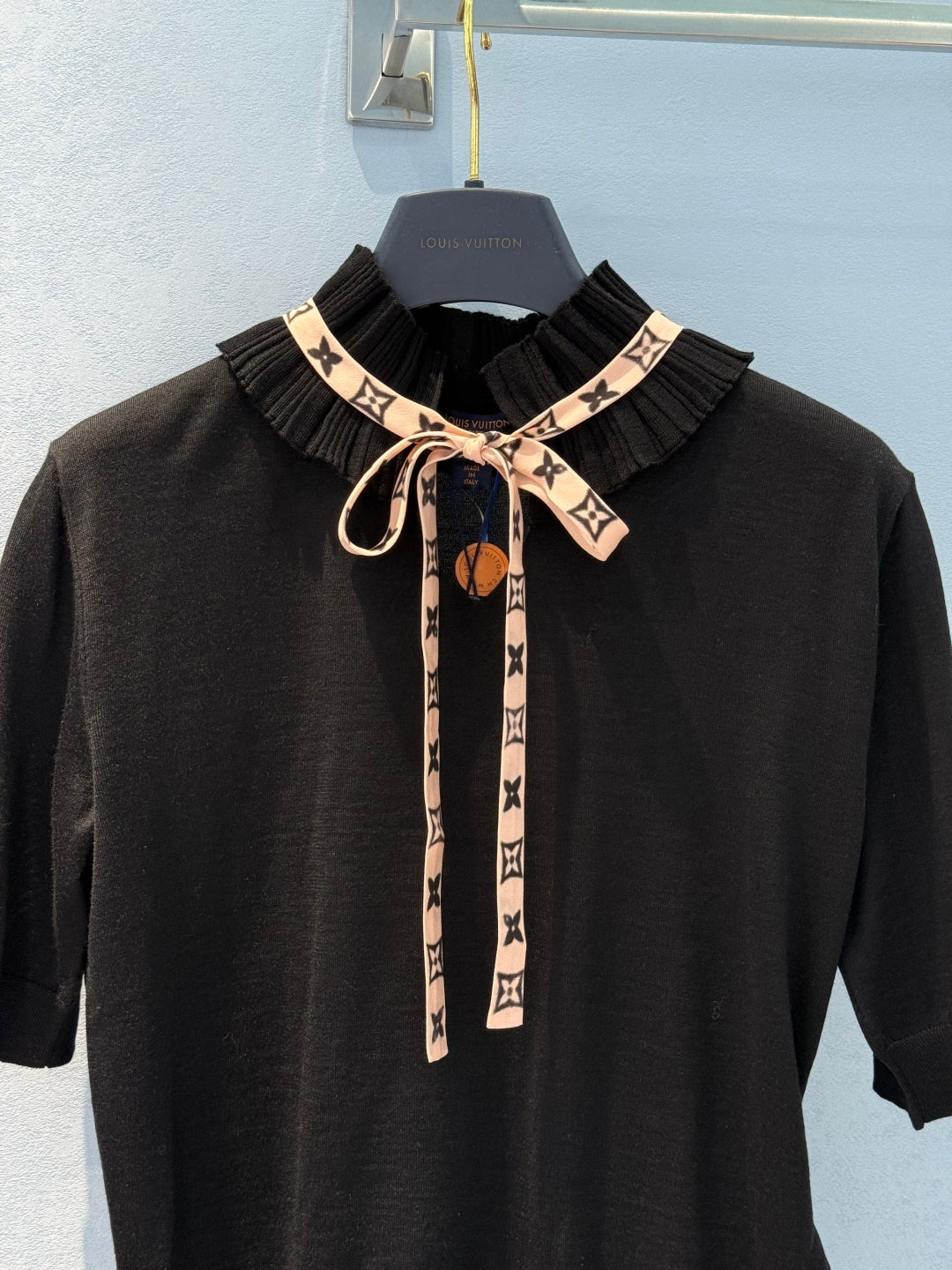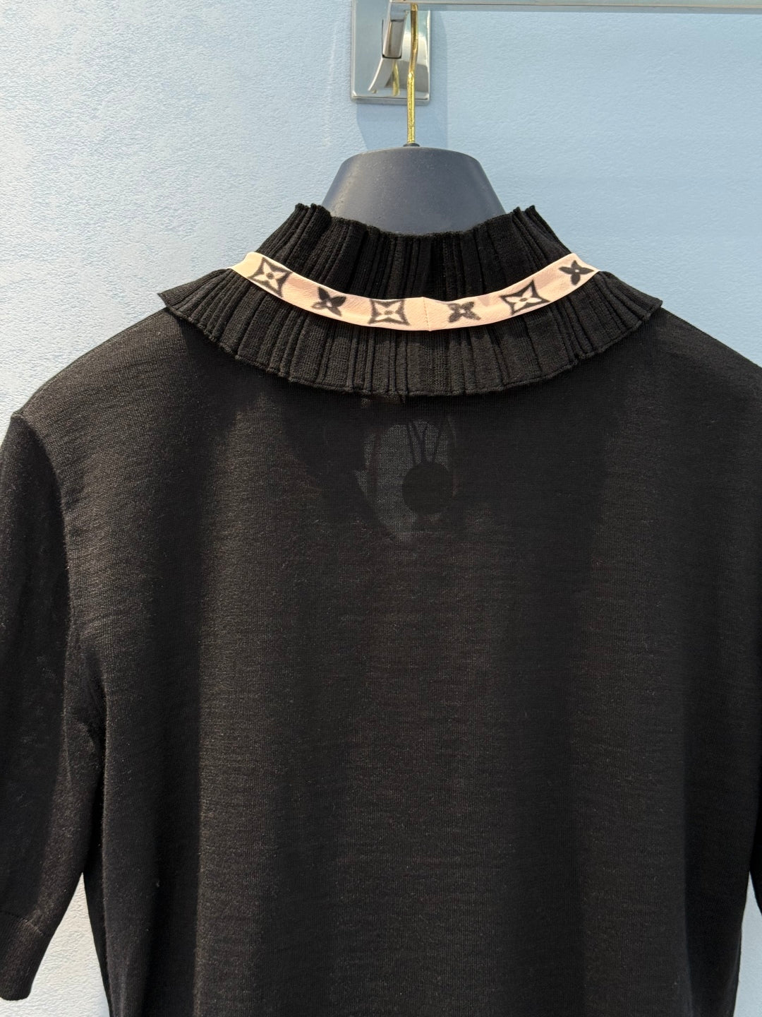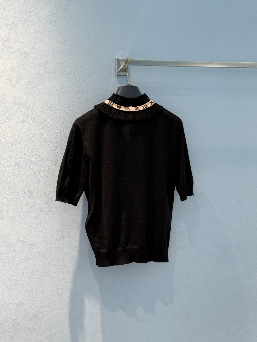 LV 25 Lace Stand-Up Collar Ribbon Short-Sleeved Shirt Black Wool Silk