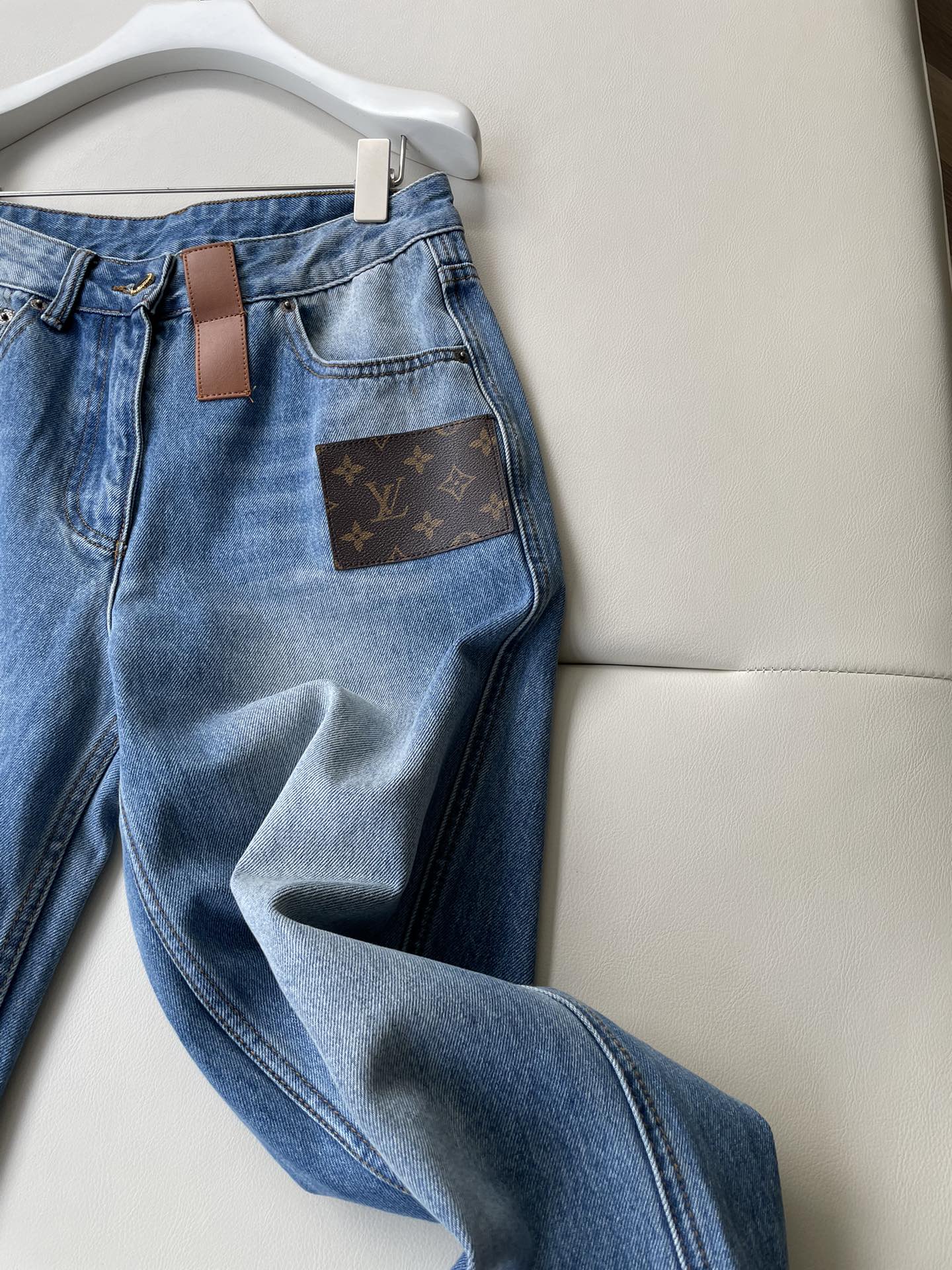 LV Flower Leather Label Straight Jeans Blue Cotton