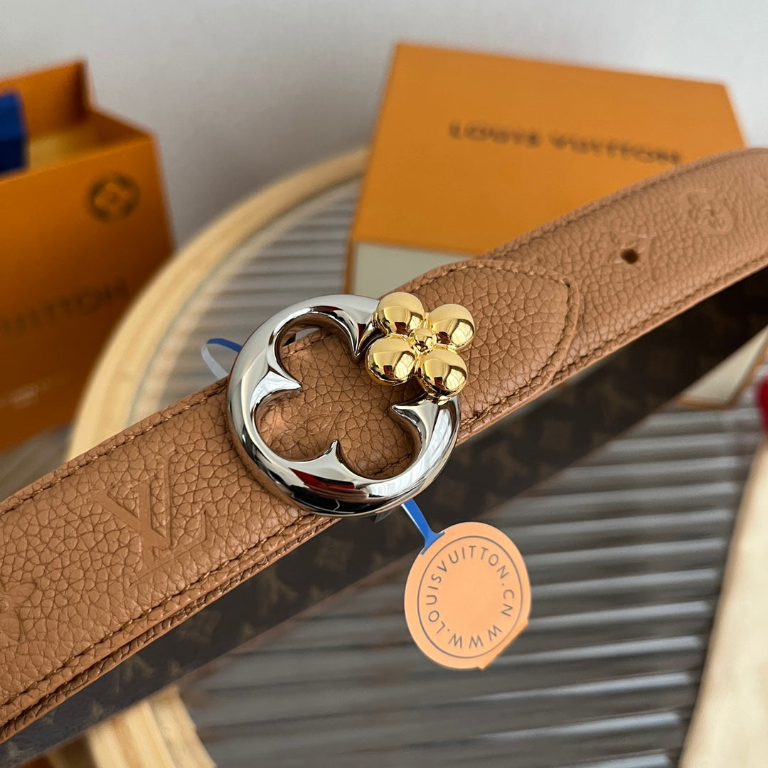 LV Flowergram Round 30mm Reversible Belt Brown Empreinte Calfskin