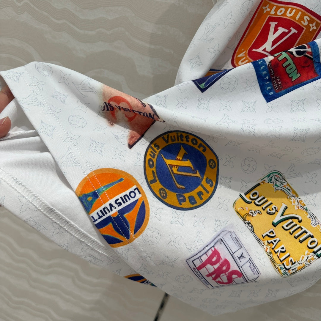 LV Pattern Logo Positioning Poster Badge Printed T-shirt White Cotton
