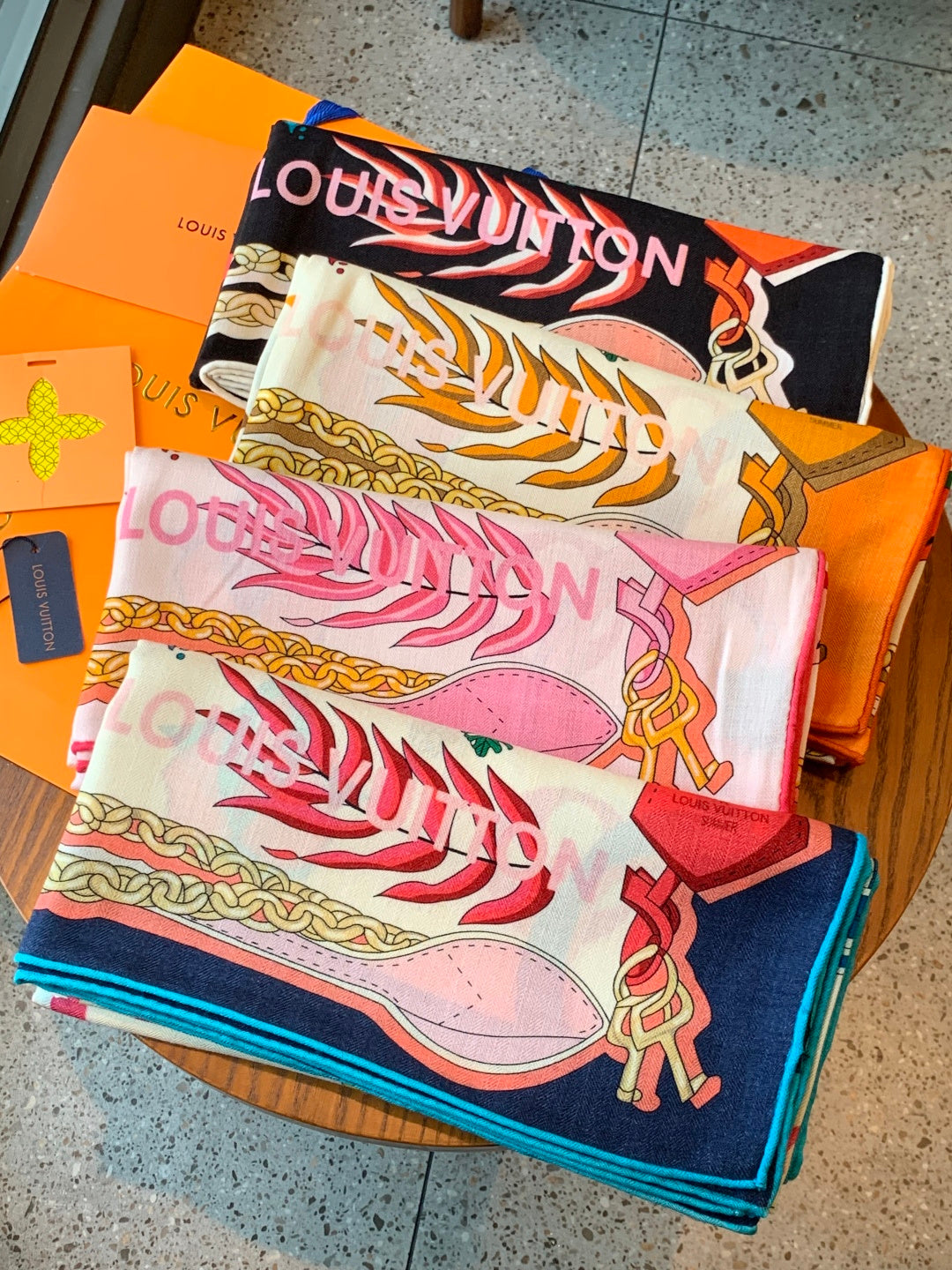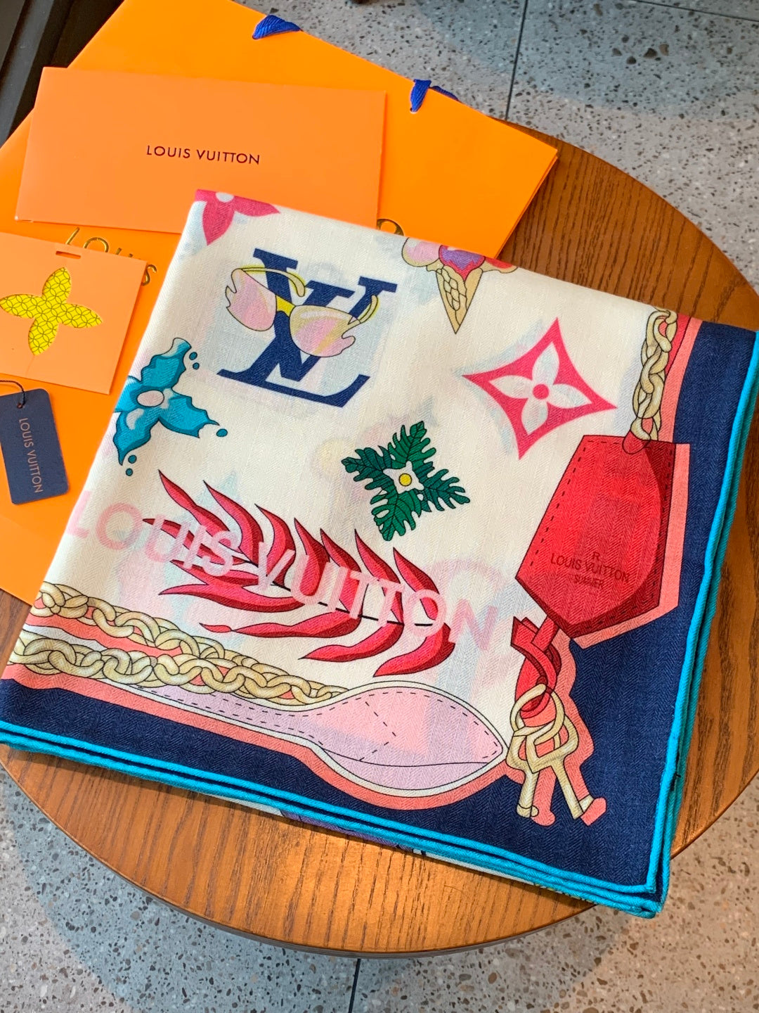 LV Scarf 135cm White Multicolor Cashmere Mulberry Silk 976763