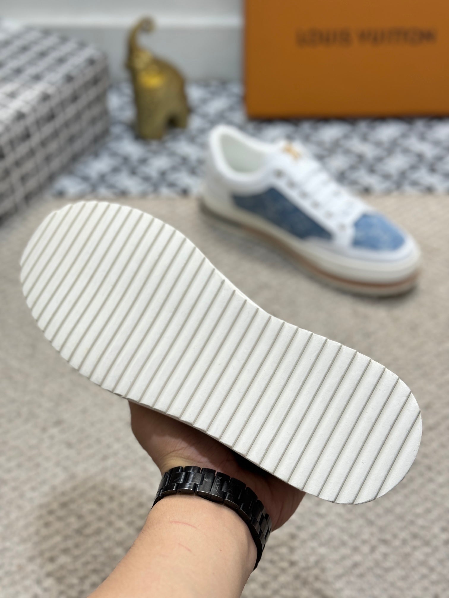 LV TRAINERS IN WHITE CALFSKIN AND SAPPHIRE BLUE JACQUARD