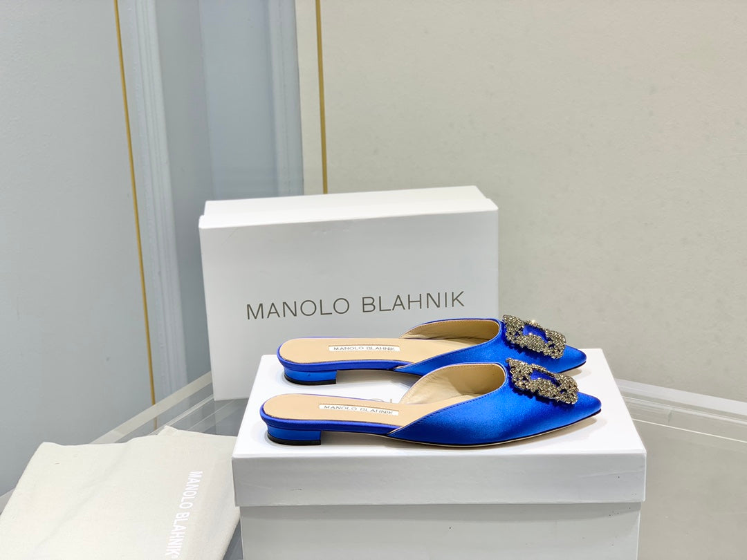 Manolo Buckle Flast Mules Navy Blue Silk 327512