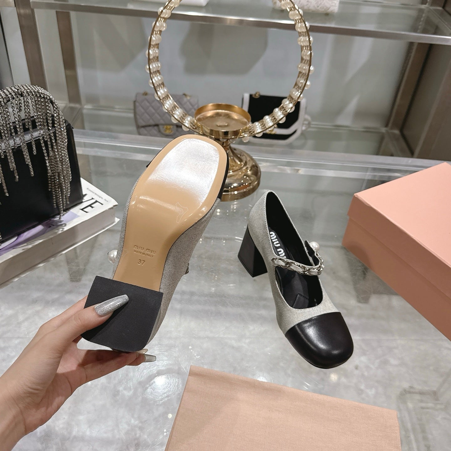 Miu 25C Mary Jane 75MM Beige Gray Mix Black Fabric 235368